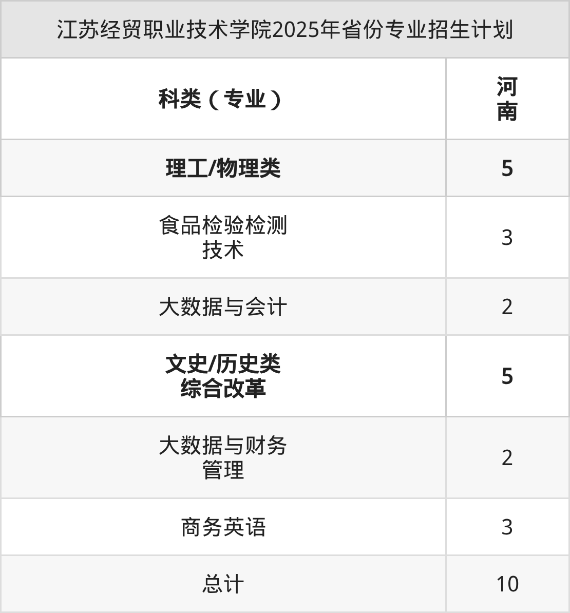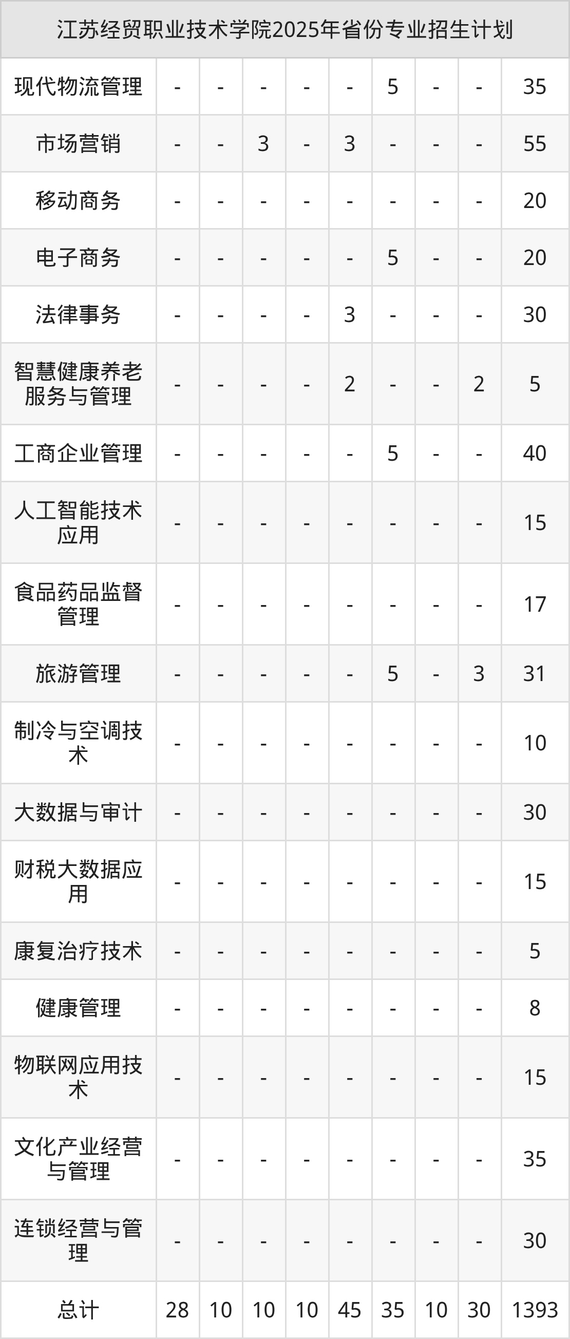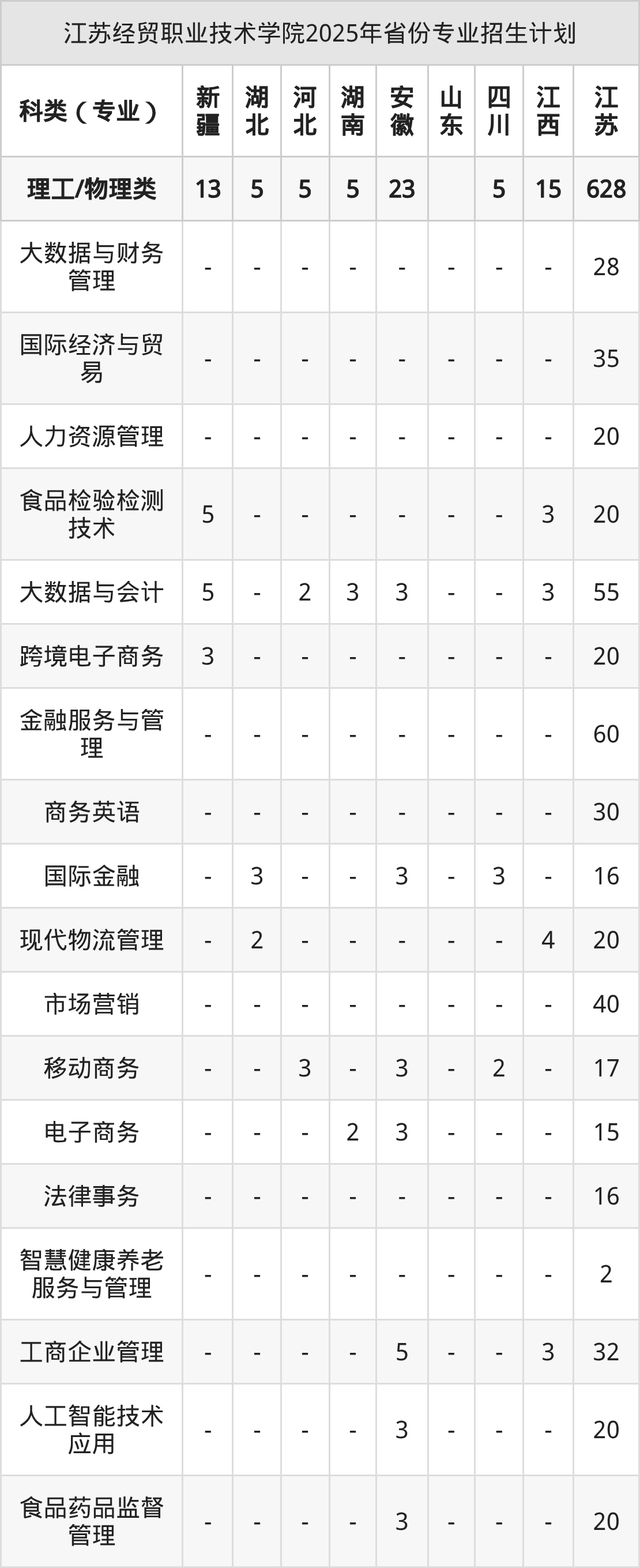 2025年江苏经贸职业技术学院计划招收专科生1581人,其中物联网应用技术专业45人,电子商务专业45人,食品检验检测技术专业50人,跨境电子商务专业50人,金融服务与管理专业149人等。