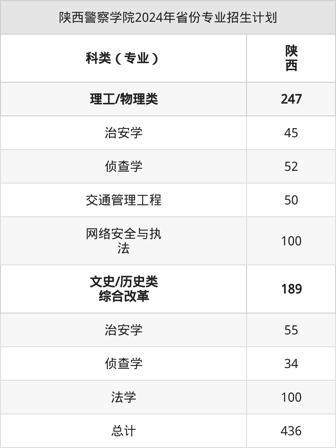 2024年陕西警察学院计划招收本科生436人,其中法学专业100人,交通管理工程专业50人,网络安全与执法专业100人,治安学专业100人,侦查学专业86人。