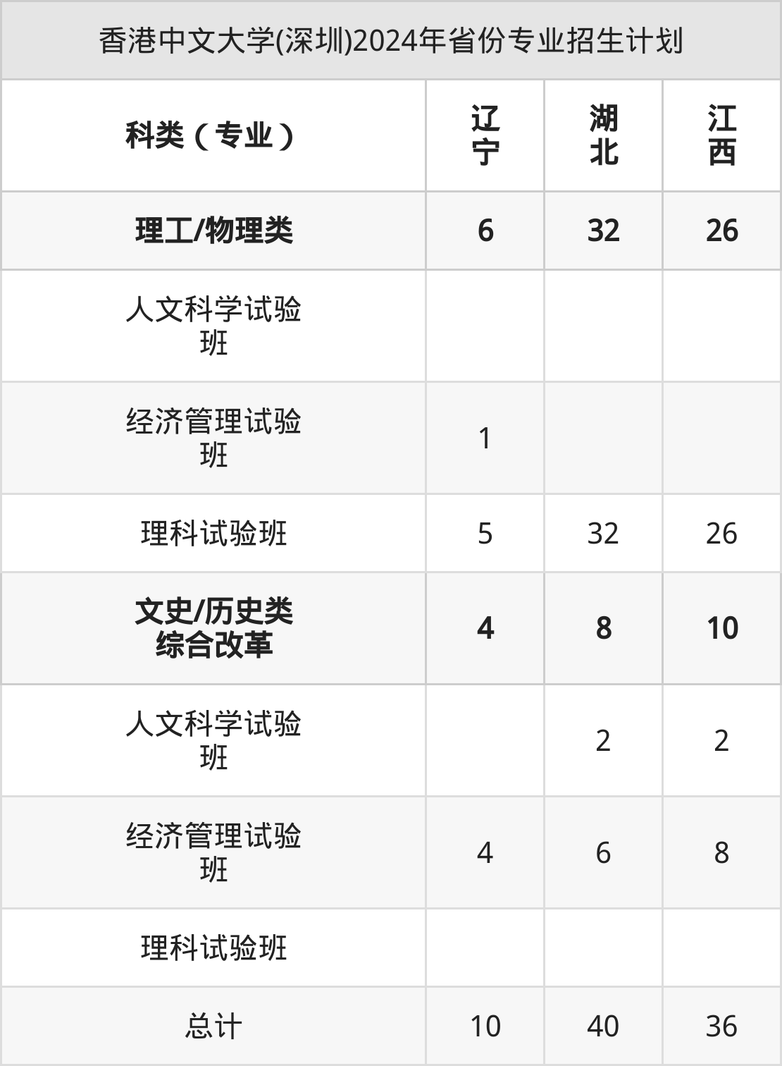 2024年香港中文大学(深圳)计划招收本科生400人,其中理科试验班专业282人,经济管理试验班专业86人,人文科学试验班专业32人。