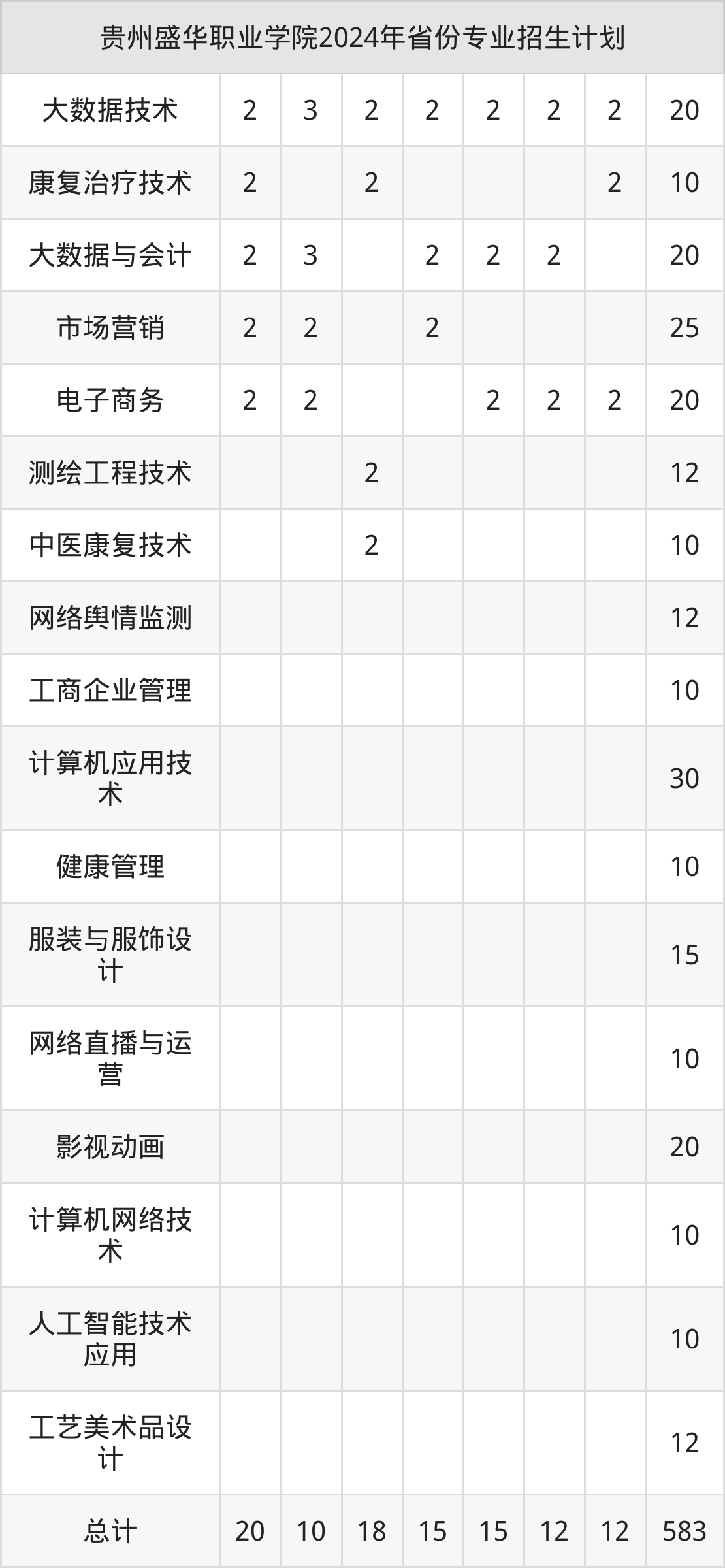而各省份的招生计划数为云南12人,重庆12人,贵州583人,河北20人,山东10人等。