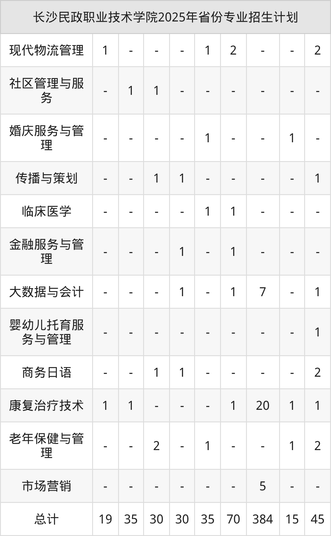 2025年长沙民政职业技术学院计划招收专科生1293人,其中心理咨询专业18人,婚庆服务与管理专业17人,临床医学专业17人,康复治疗技术专业70人,老年保健与管理专业10人等。