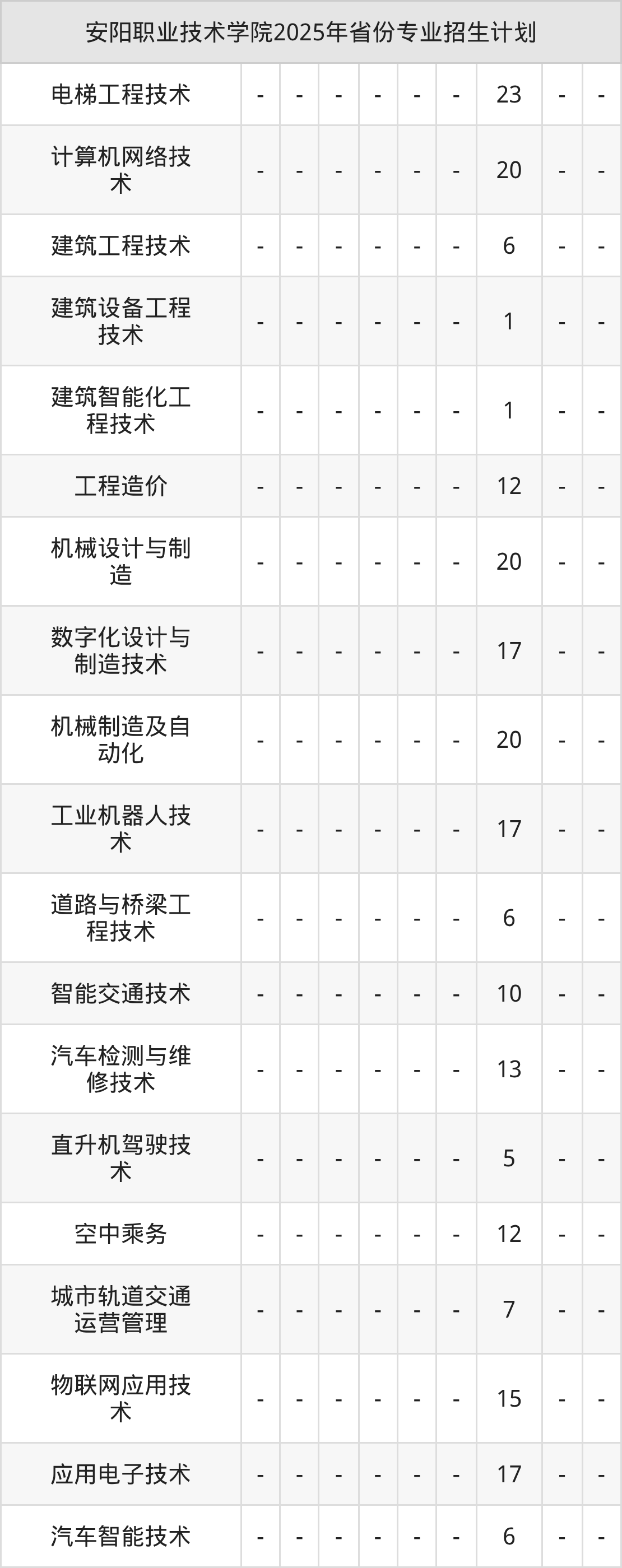 2025年安阳职业技术学院计划招收专科生2832人,其中机械设计与制造专业45人,智能交通技术专业15人,直升机驾驶技术专业8人,汽车智能技术专业10人,大数据技术专业2人等。