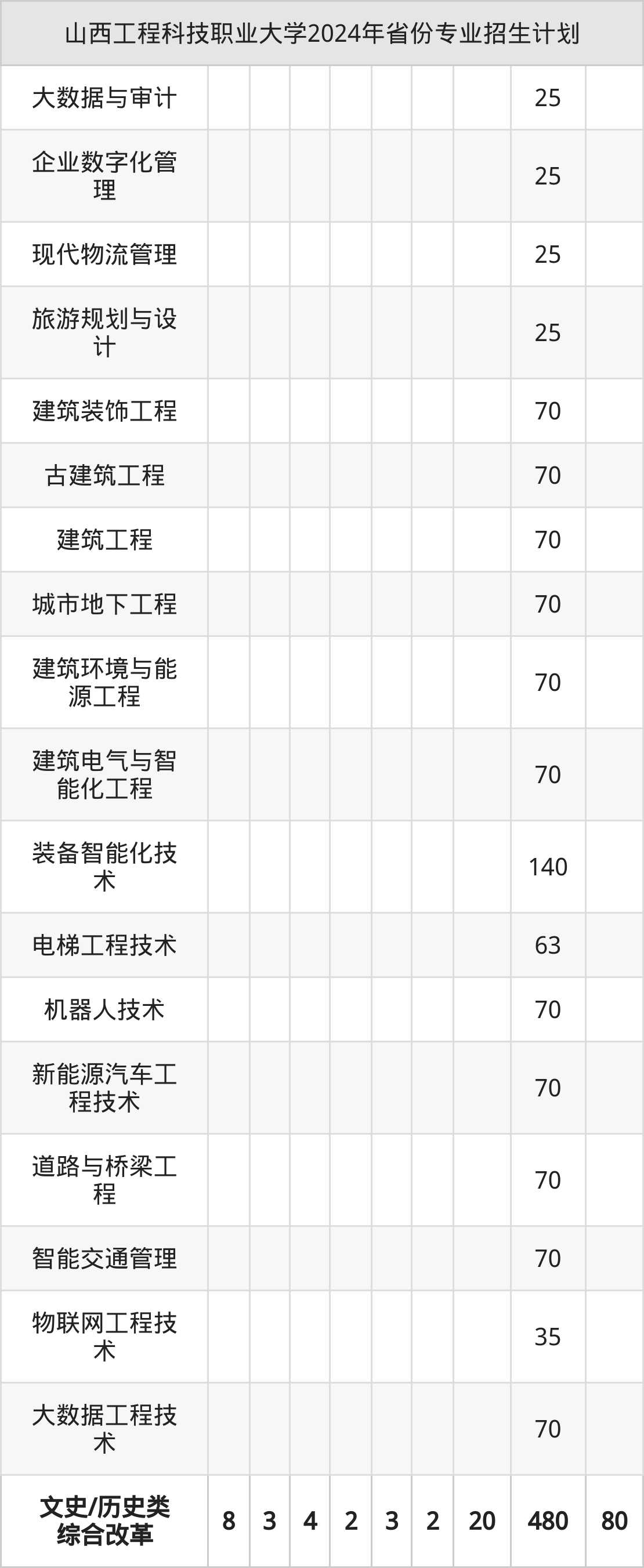 2024年山西工程科技职业大学计划招收本科生2563人,其中智能建造工程专业70人,工程造价专业105人,物流工程技术专业70人,古建筑工程专业70人,电子信息工程技术专业70人等。