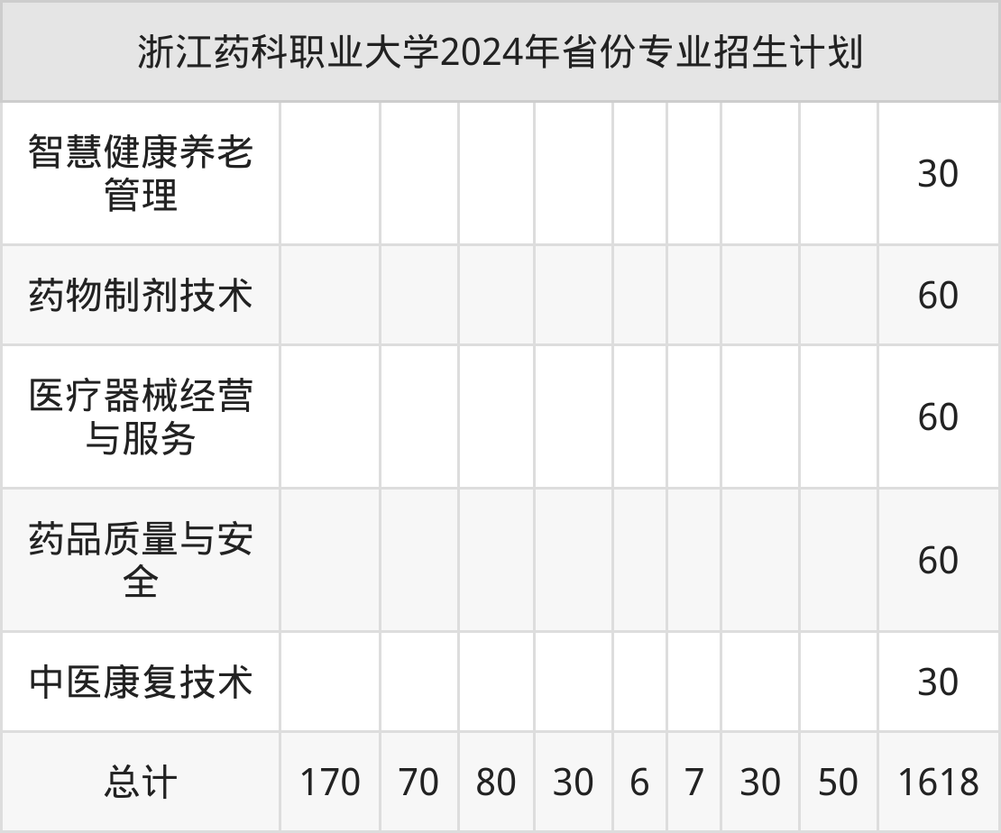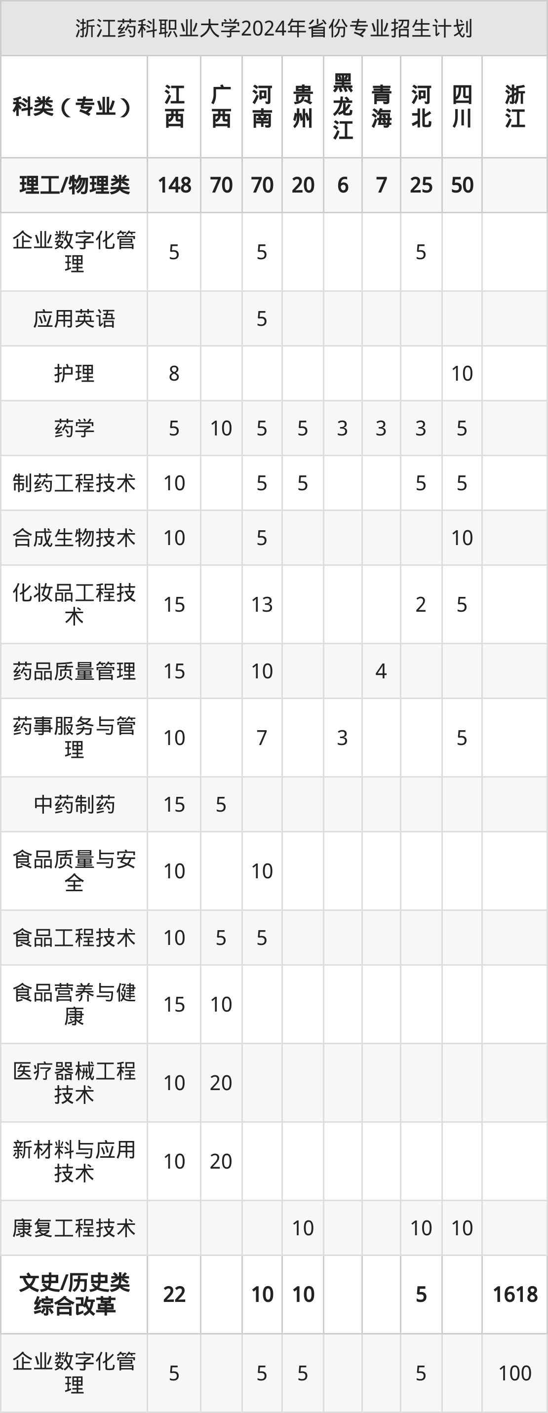 而各省份的招生计划数为四川50人,浙江1618人,江西170人,广西70人,河南80人等。