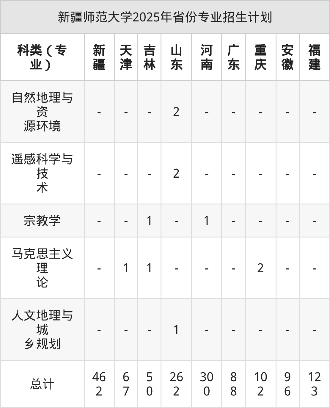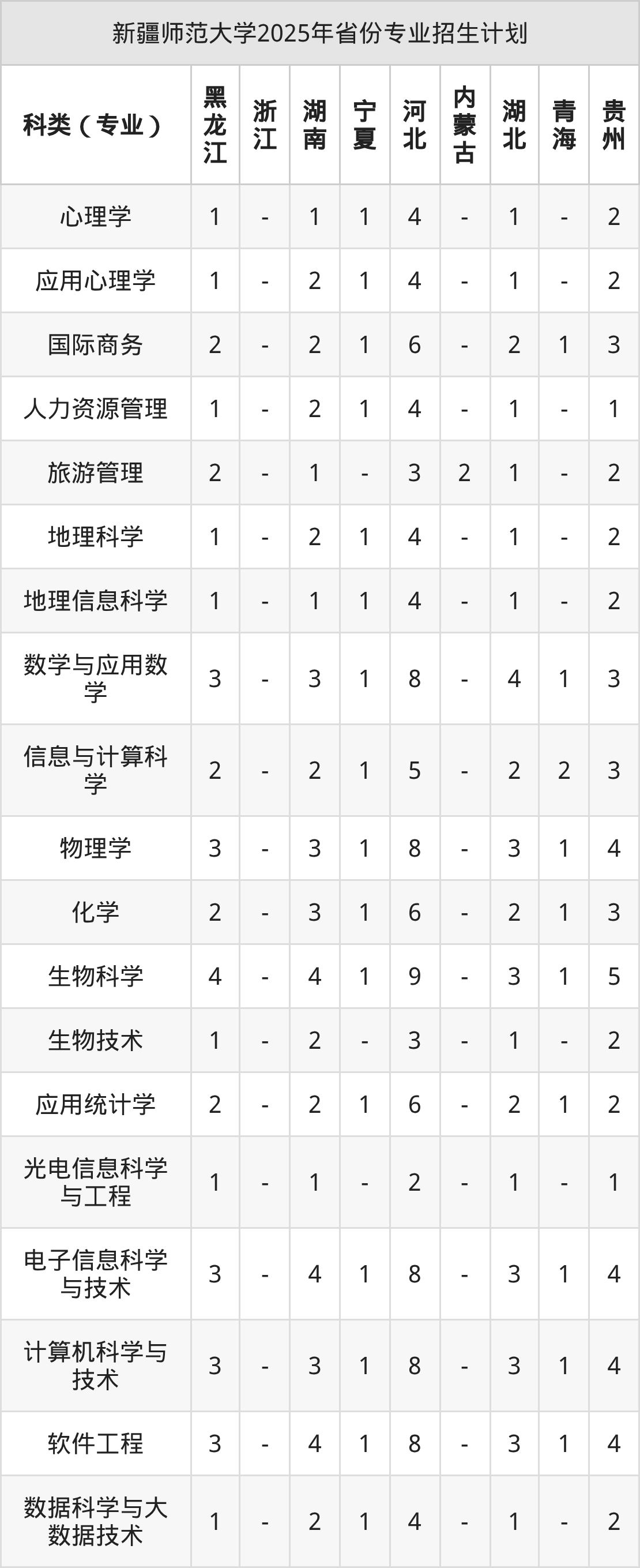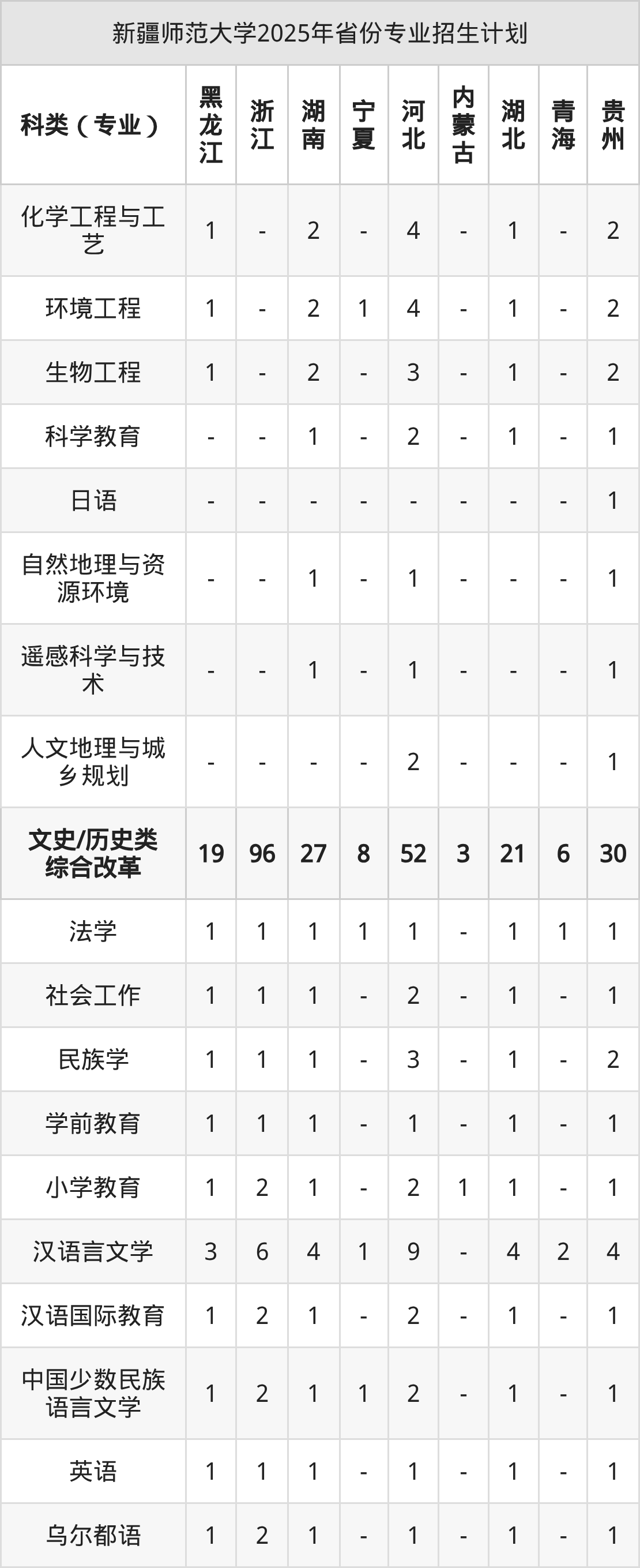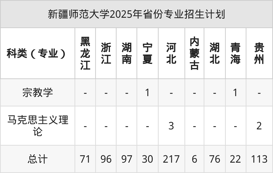 而各省份的招生计划数为宁夏30人,河北217人,内蒙古6人,贵州113人,新疆462人等。
