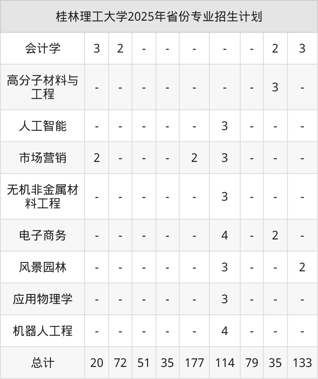 2025年桂林理工大学计划招收本科生6141人,其中计算机网络技术专业4人,机械设计制造及其自动化专业186人,自动化专业85人,会计学专业153人,土木、水利与交通工程专业60人等。