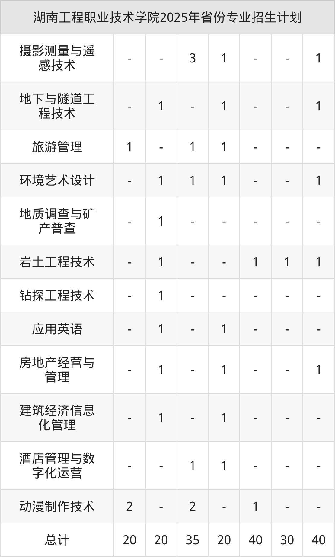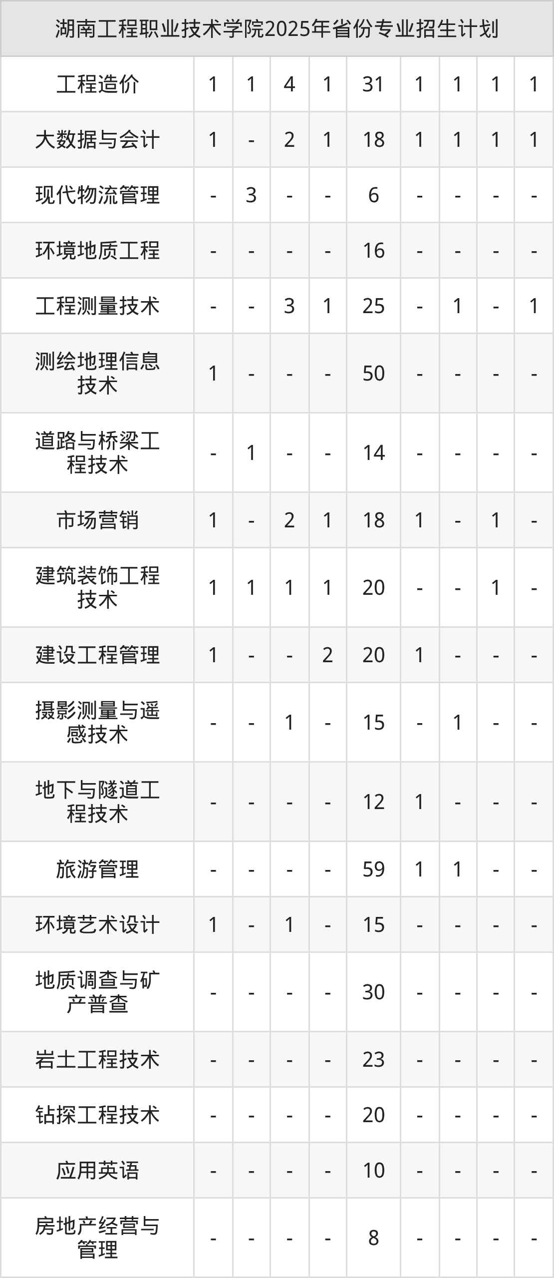 2025年湖南工程职业技术学院计划招收专科生2048人,其中工程测量技术专业92人,建设工程管理专业65人,电子信息工程技术专业45人,计算机应用技术专业40人,钻探工程技术专业47人等。