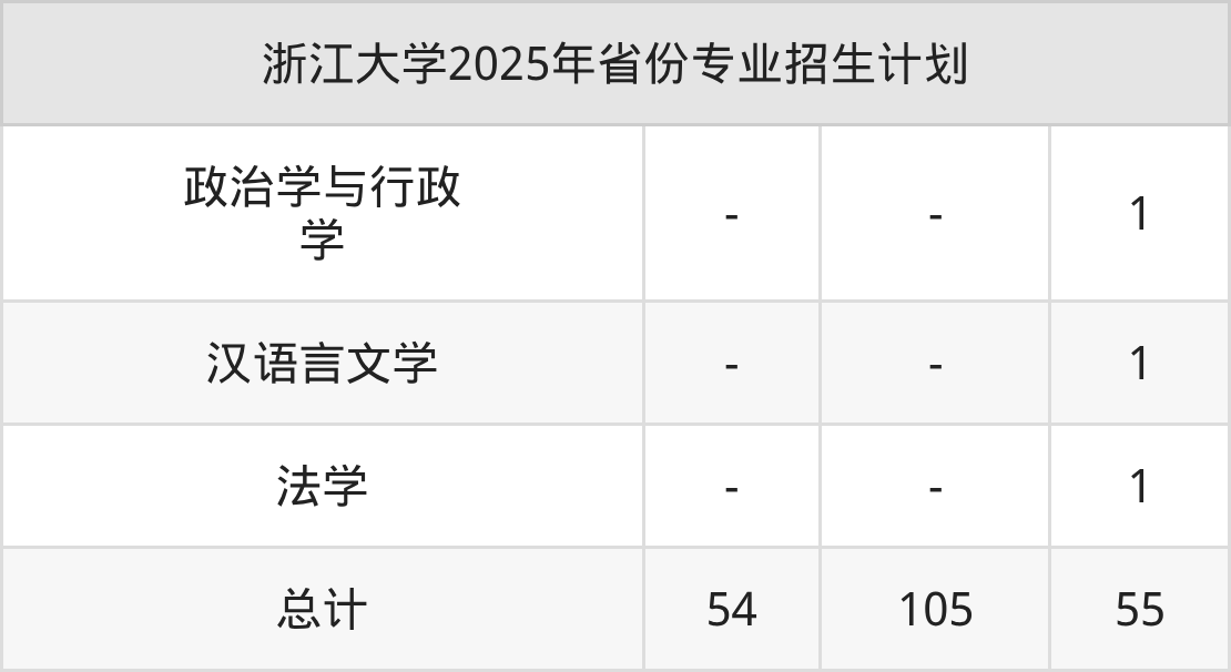 2025年浙江大学计划招收本科生3825人,其中汉语言文学专业1人,材料科学与工程专业1人,临床医学专业1人,社会科学试验班专业485人,医学试验班专业56人等。