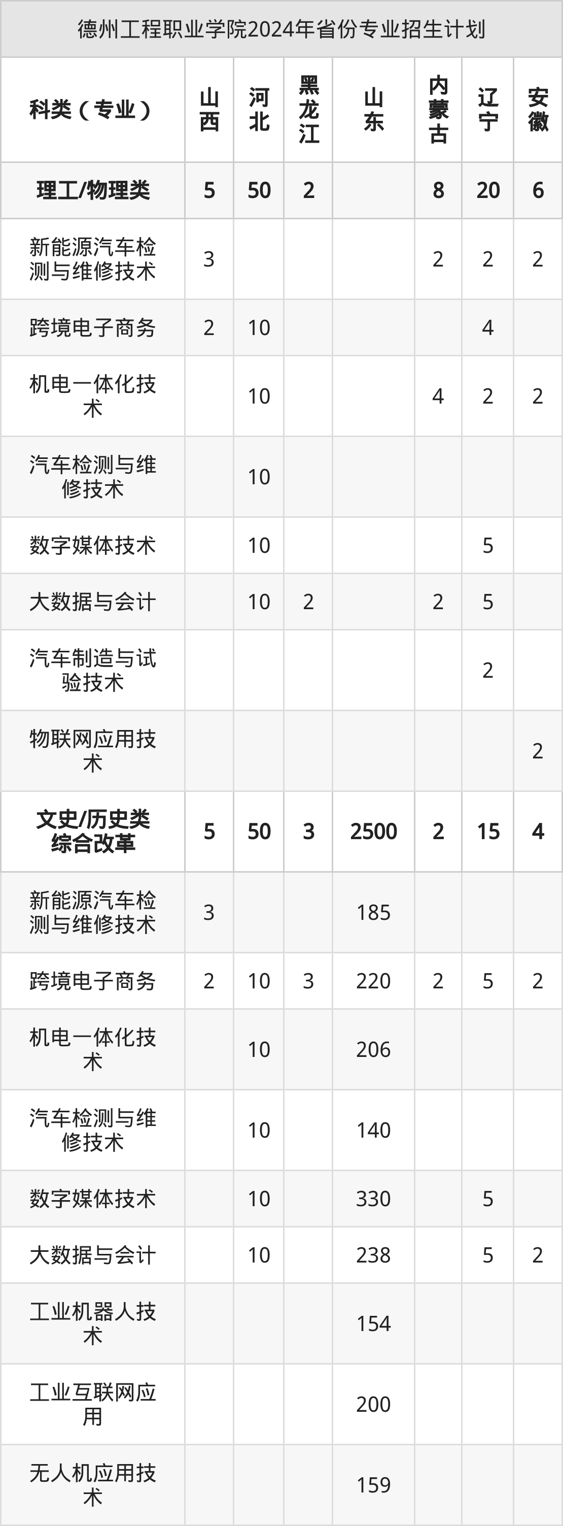 2025年德州工程职业学院专科招生计划待公布,下面附上2024年数据,暂供参考: