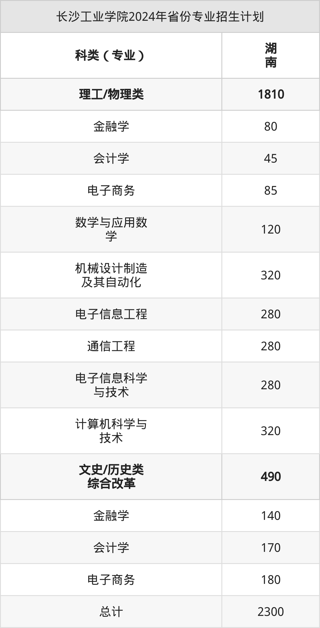 2024年长沙工业学院计划招收本科生2300人,其中通信工程专业280人,计算机科学与技术专业320人,机械设计制造及其自动化专业320人,会计学专业215人,电子商务专业265人等。