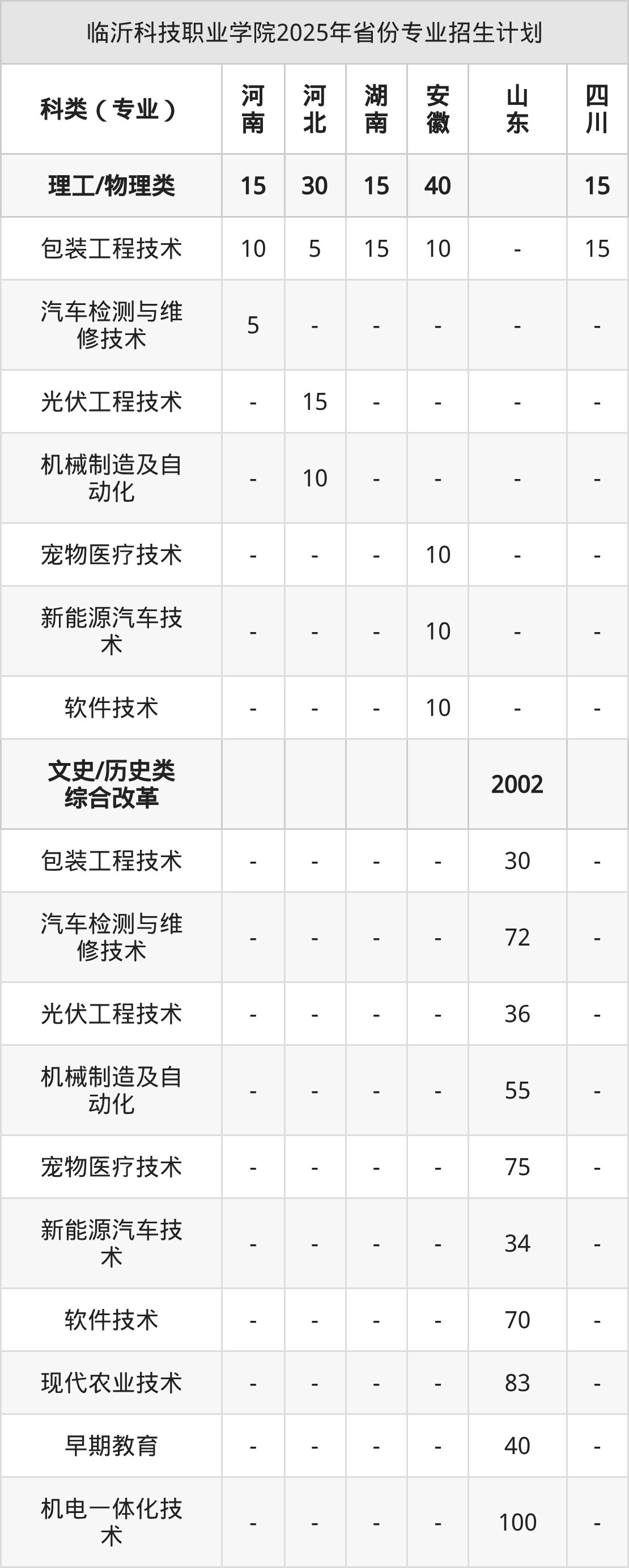 而各省份的招生计划数为安徽40人,山东2002人,四川15人,河南15人,河北30人等。