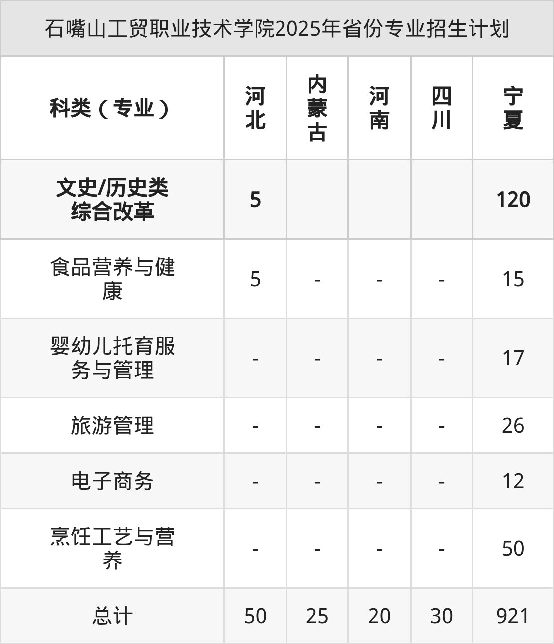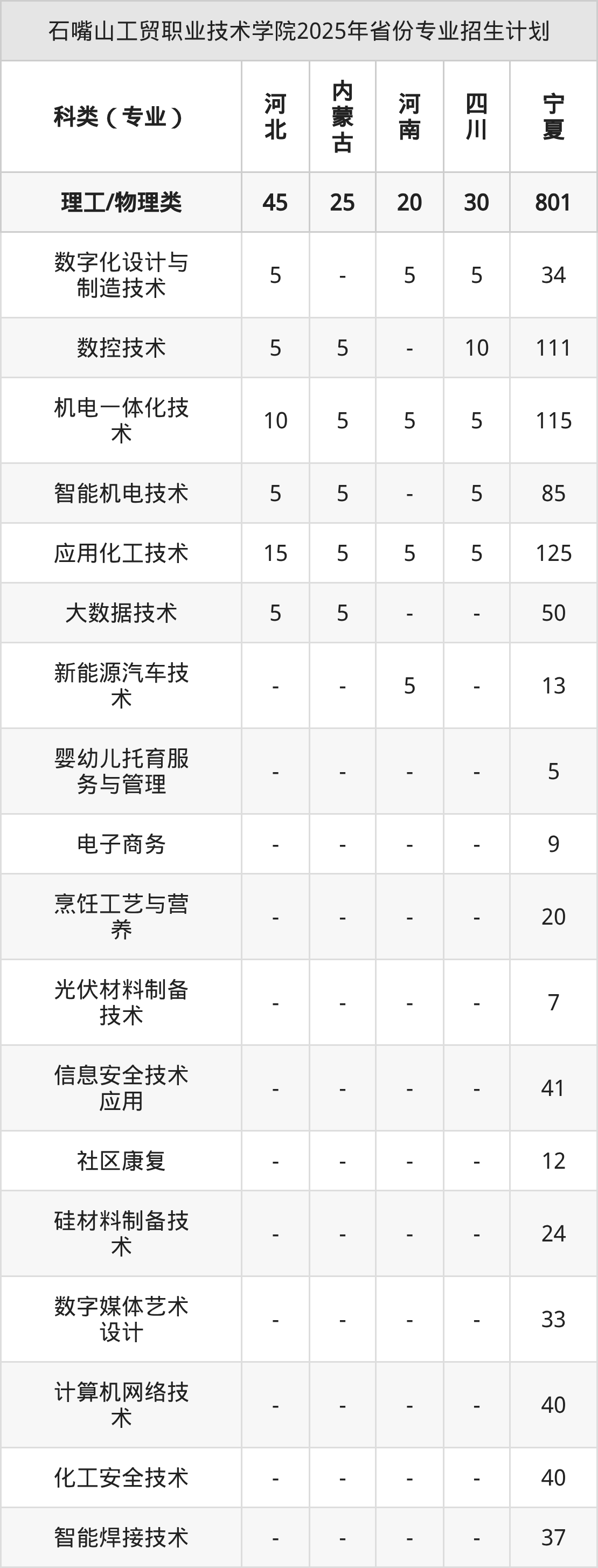 2026年石嘴山工贸职业技术学院专科招生计划待公布,下面附上2025年数据,暂供参考:
