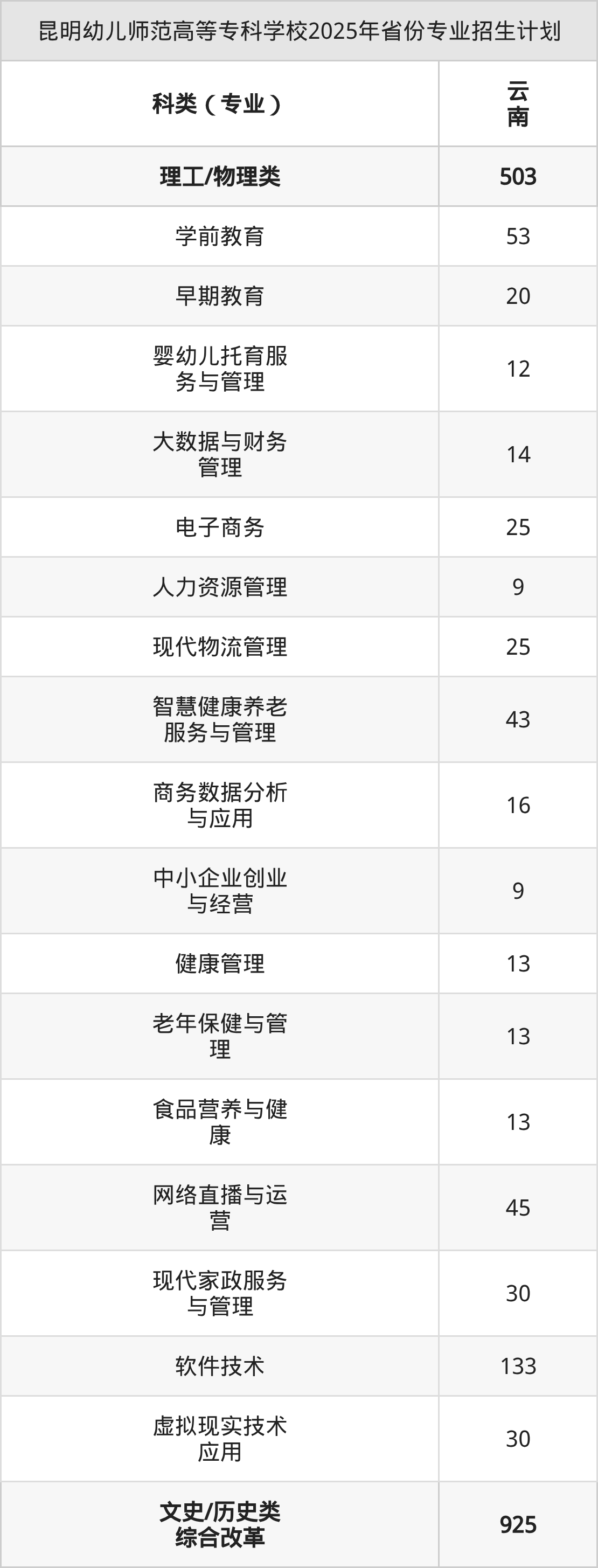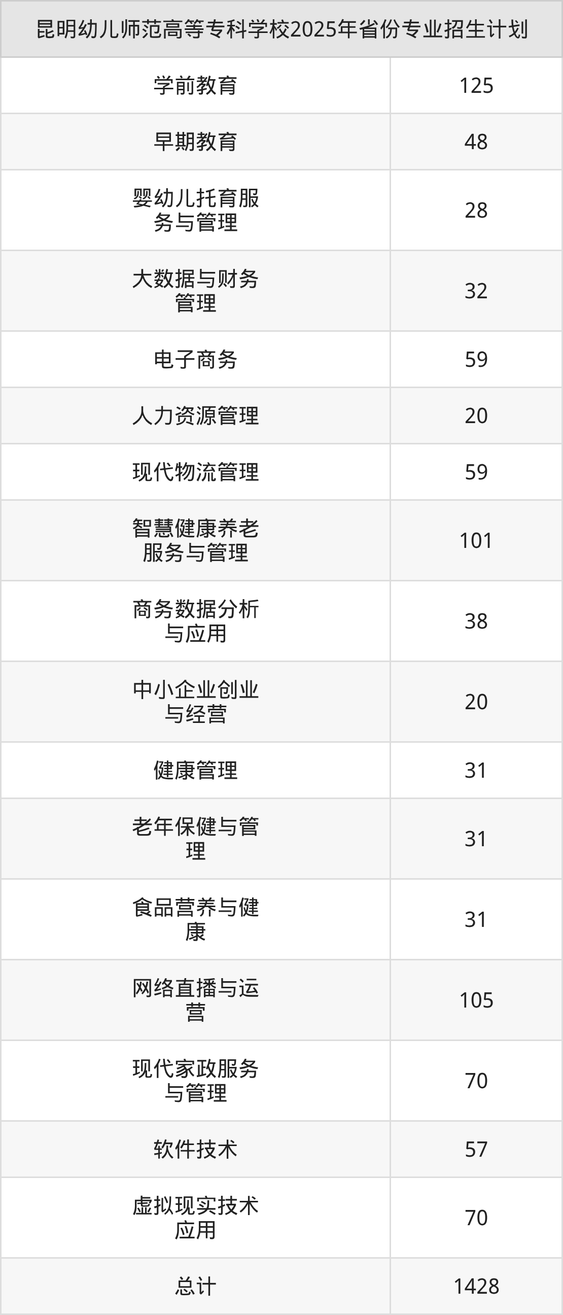 2026年昆明幼儿师范高等专科学校专科招生计划待公布,下面附上2025年数据,暂供参考: