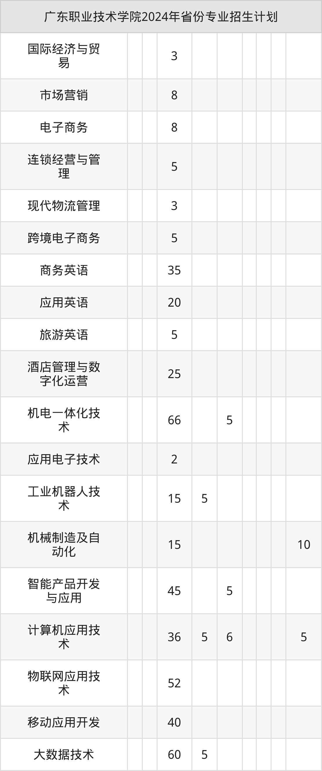2024年广东职业技术学院计划招收专科生2340人,其中应用英语专业60人,移动应用开发专业65人,汽车技术服务与营销专业7人,现代物流管理专业8人,机电一体化技术专业85人等。