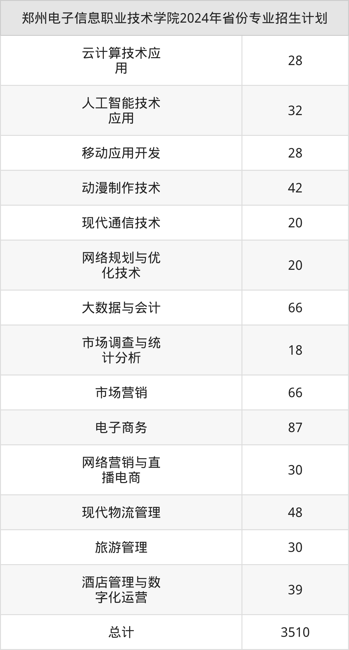 2024年郑州电子信息职业技术学院计划招收专科生3510人,其中移动应用开发专业70人,市场营销专业110人,旅游管理专业50人,工业机器人技术专业40人,城市轨道车辆应用技术专业80人等。