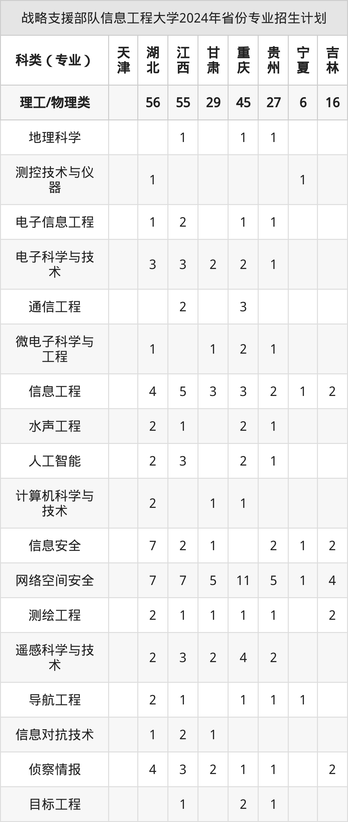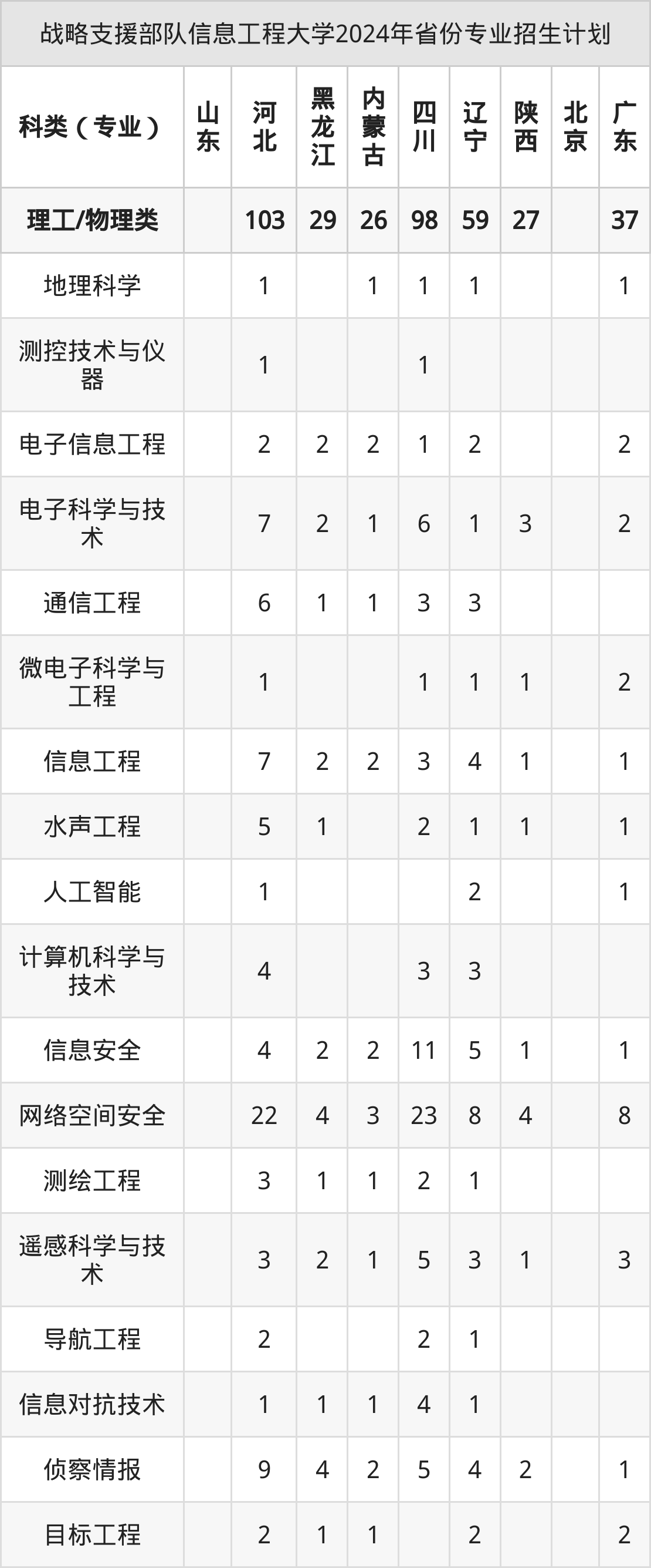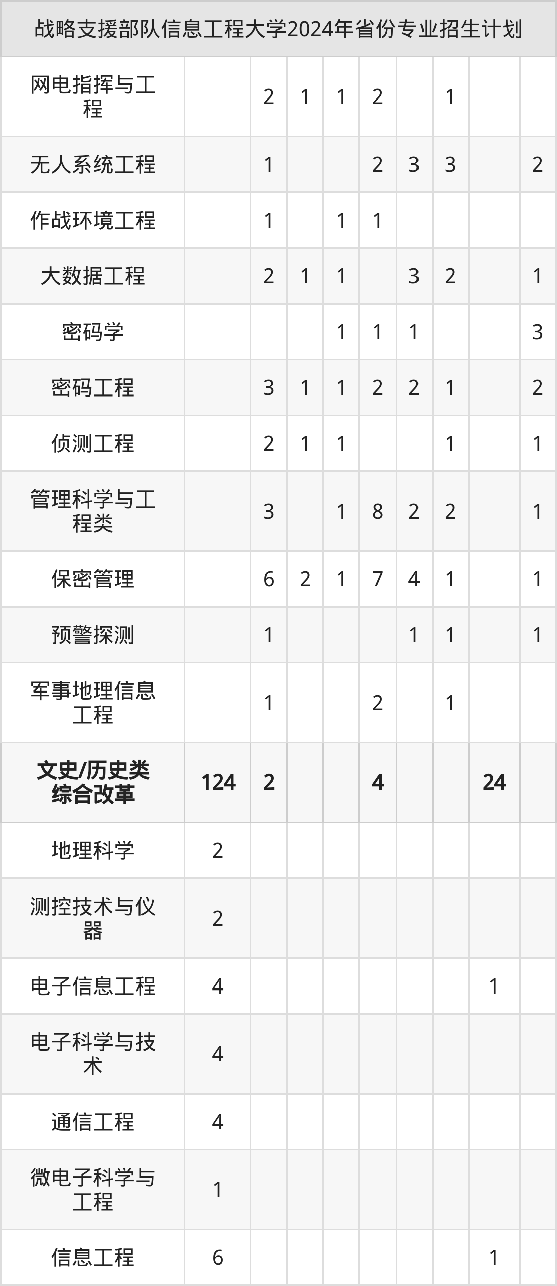 2025年战略支援部队信息工程大学本科招生计划待公布,下面附上2024年数据,暂供参考: