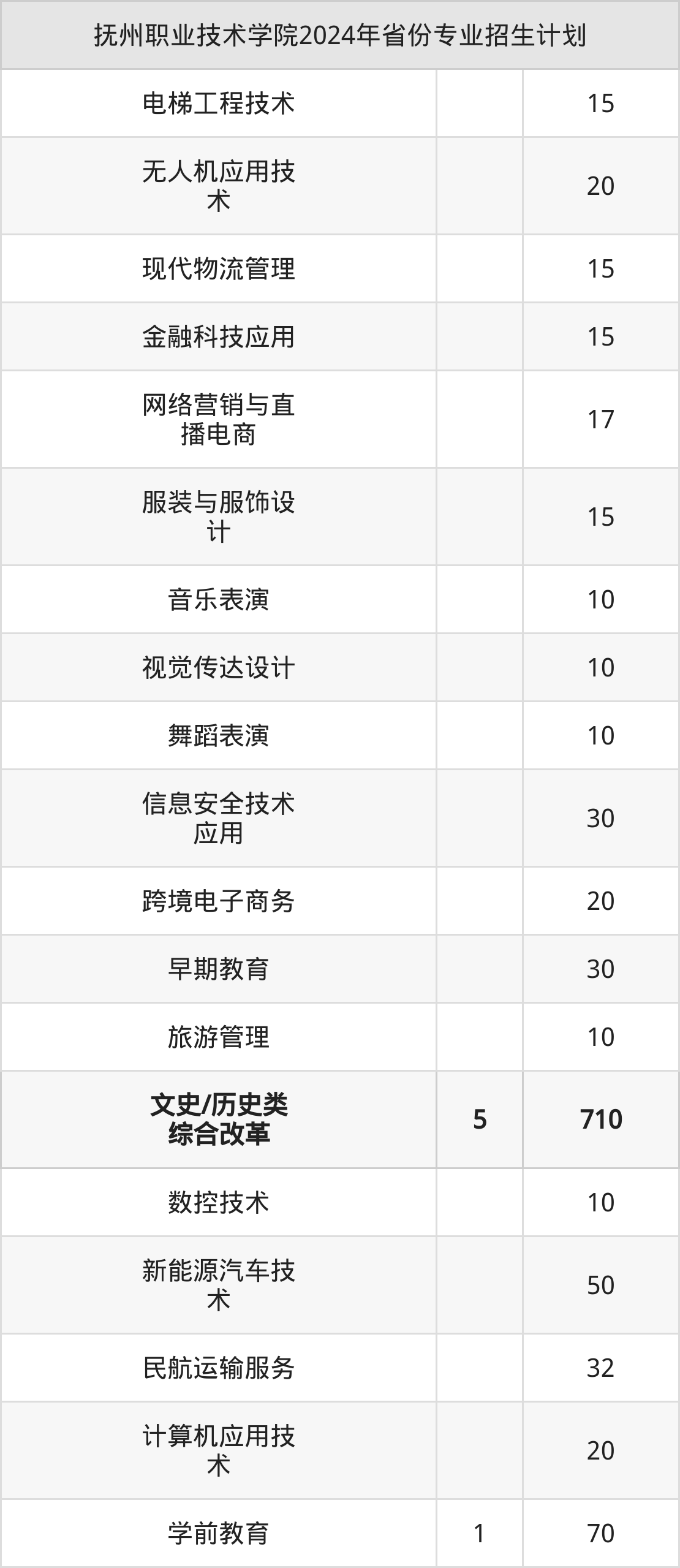 2024年抚州职业技术学院计划招收专科生1505人,其中云计算技术应用专业28人,电梯工程技术专业25人,信息安全技术应用专业56人,旅游管理专业33人,金融科技应用专业33人等。