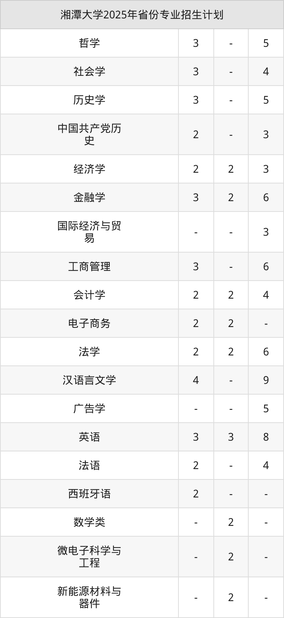 2025年湘潭大学计划招收本科生8787人,其中微电子科学与工程专业160人,社会学专业80人,电子商务专业80人,信用风险管理与法律防控专业80人,新闻学专业120人等。