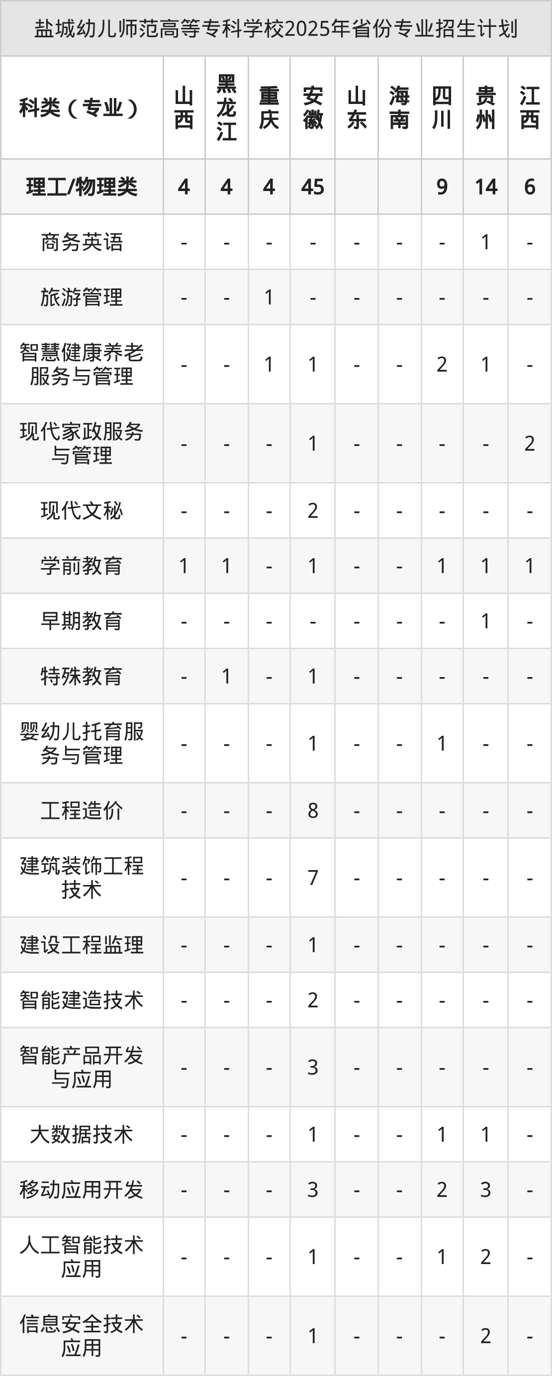 2025年盐城幼儿师范高等专科学校计划招收专科生1521人,其中工程造价专业45人,建设工程监理专业20人,移动应用开发专业40人,人工智能技术应用专业90人,智慧旅游技术应用专业19人等。