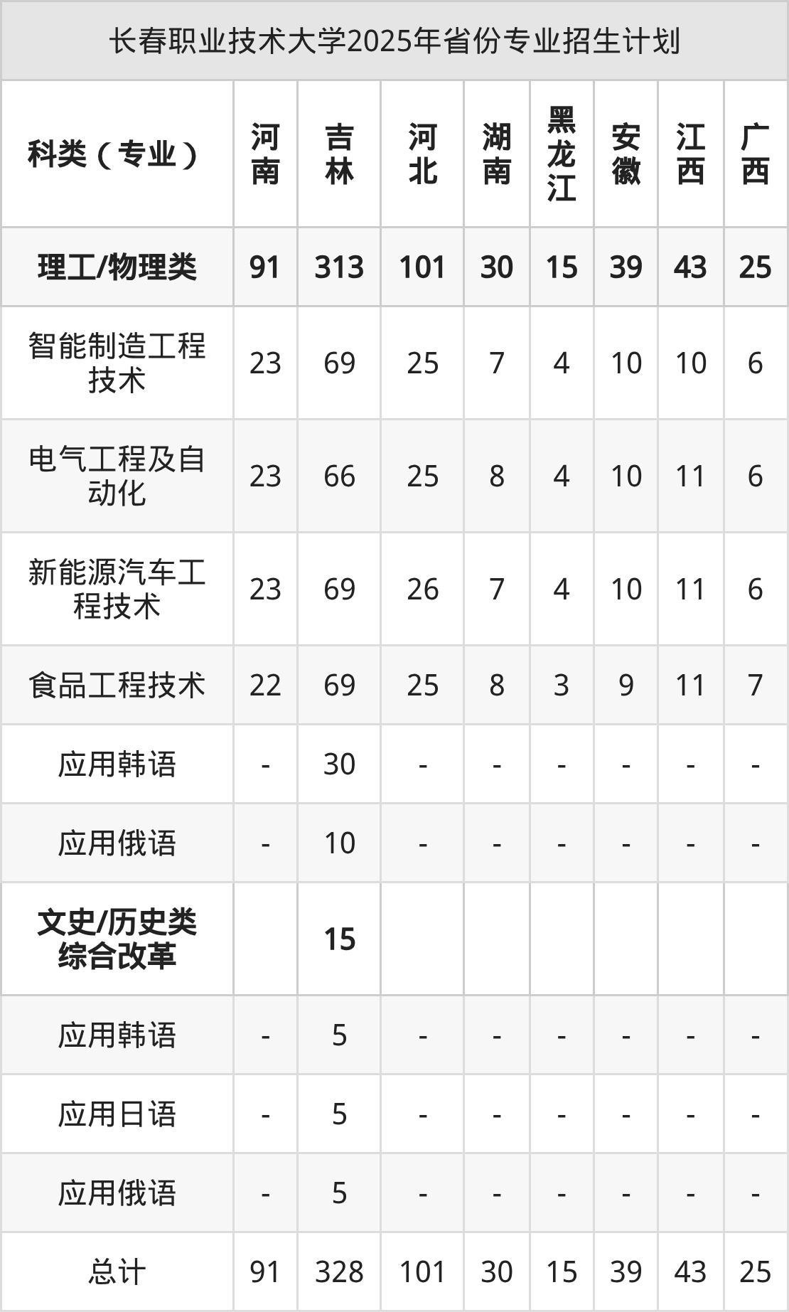 2025年长春职业技术大学计划招收本科生672人,其中智能制造工程技术专业154人,电气工程及自动化专业153人,新能源汽车工程技术专业156人,食品工程技术专业154人,应用韩语专业35人等。