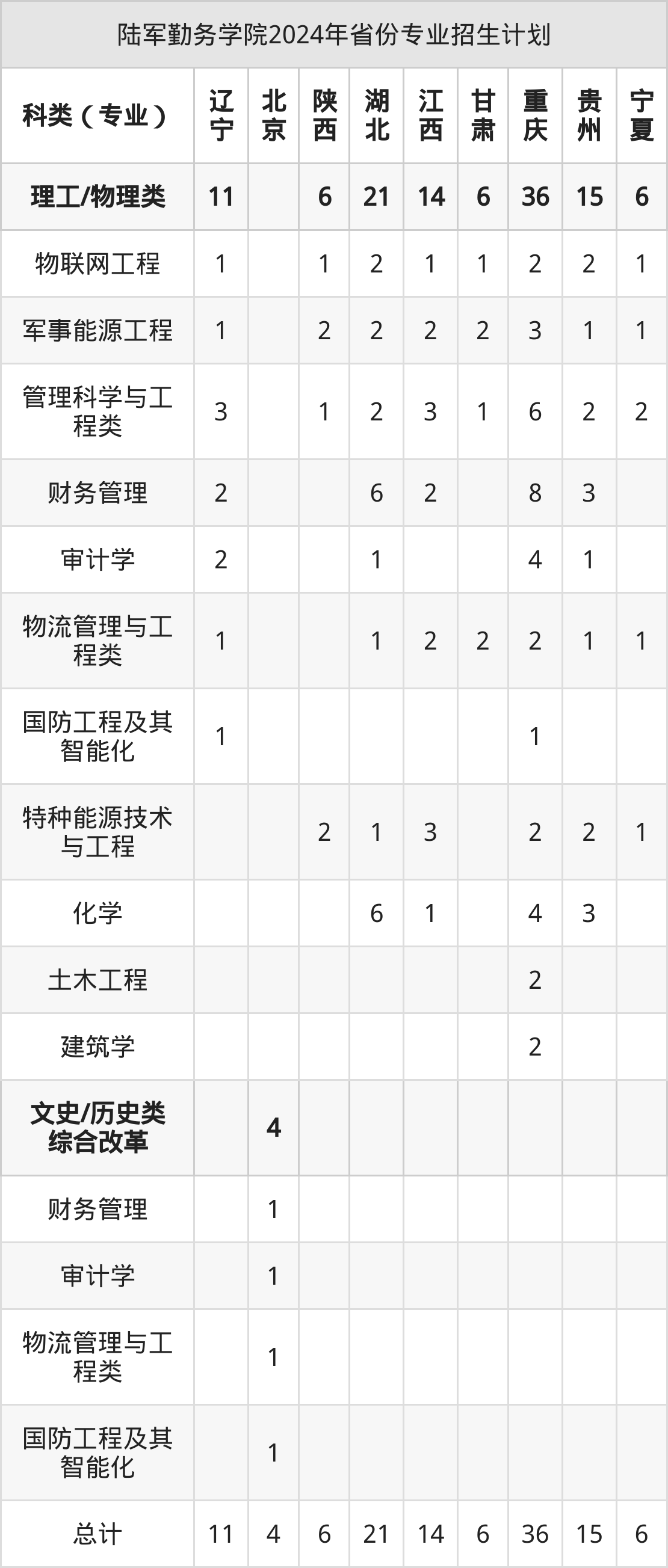而各省份的招生计划数为贵州15人,宁夏6人,四川28人,江西14人,重庆36人等。