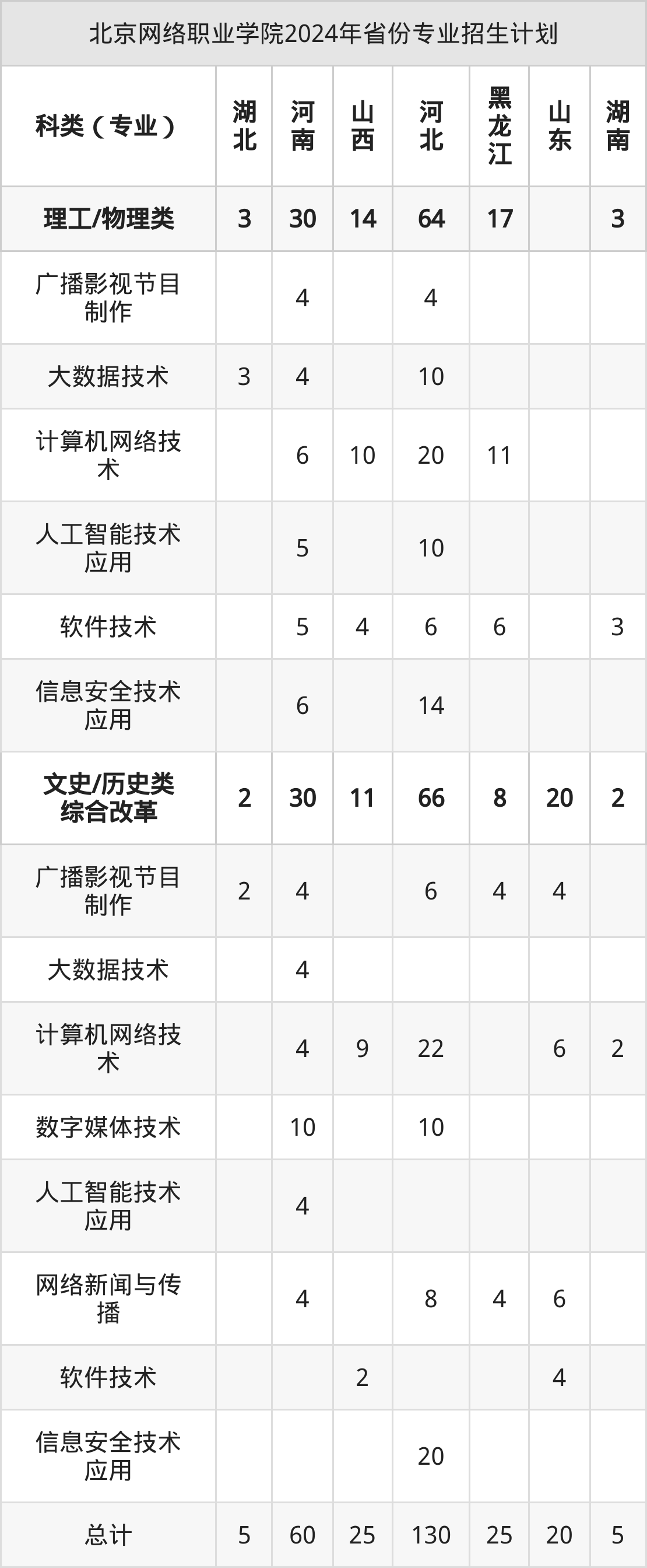 而各省份的招生计划数为湖北5人,河南60人,山西25人,河北130人,黑龙江25人等。