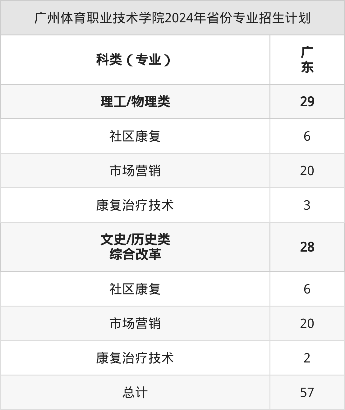 2024年广州体育职业技术学院计划招收专科生57人,其中社区康复专业12人,市场营销专业40人,康复治疗技术专业5人。