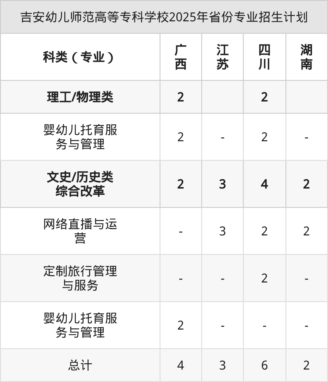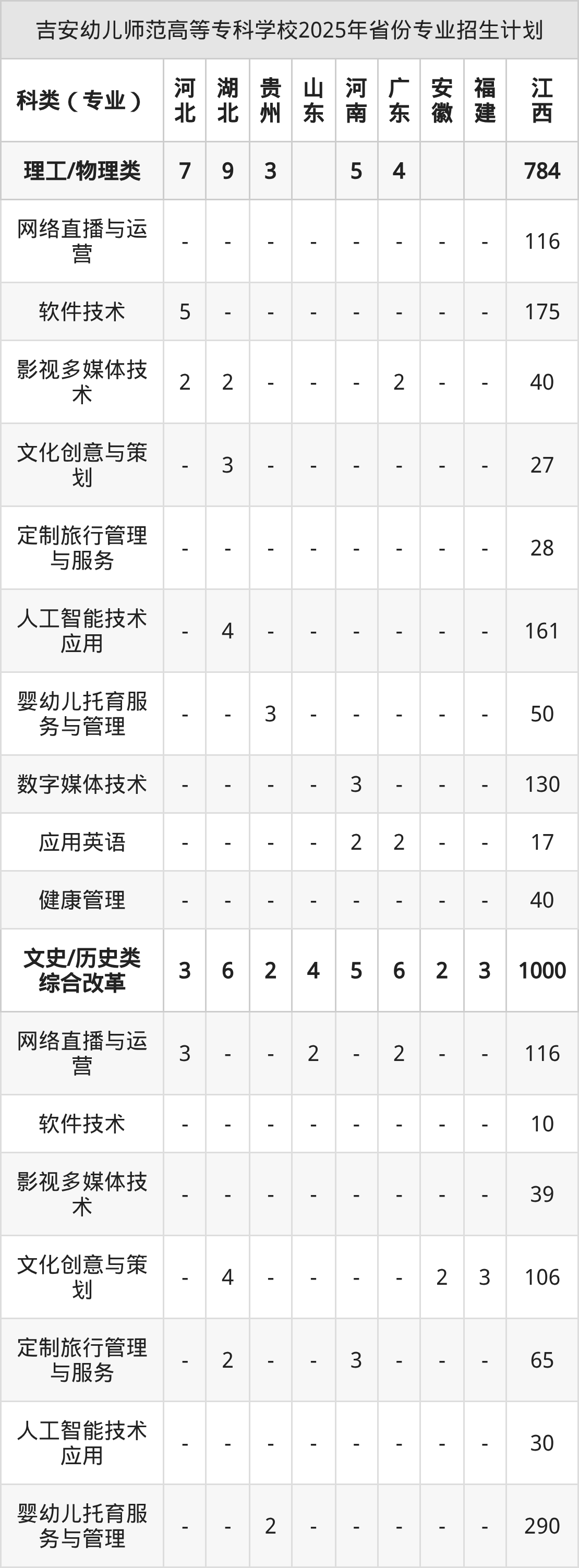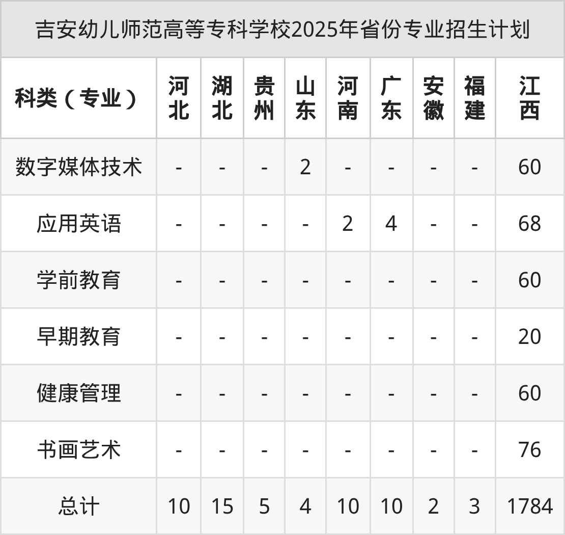 2026年吉安幼儿师范高等专科学校专科招生计划待公布,下面附上2025年数据,暂供参考: