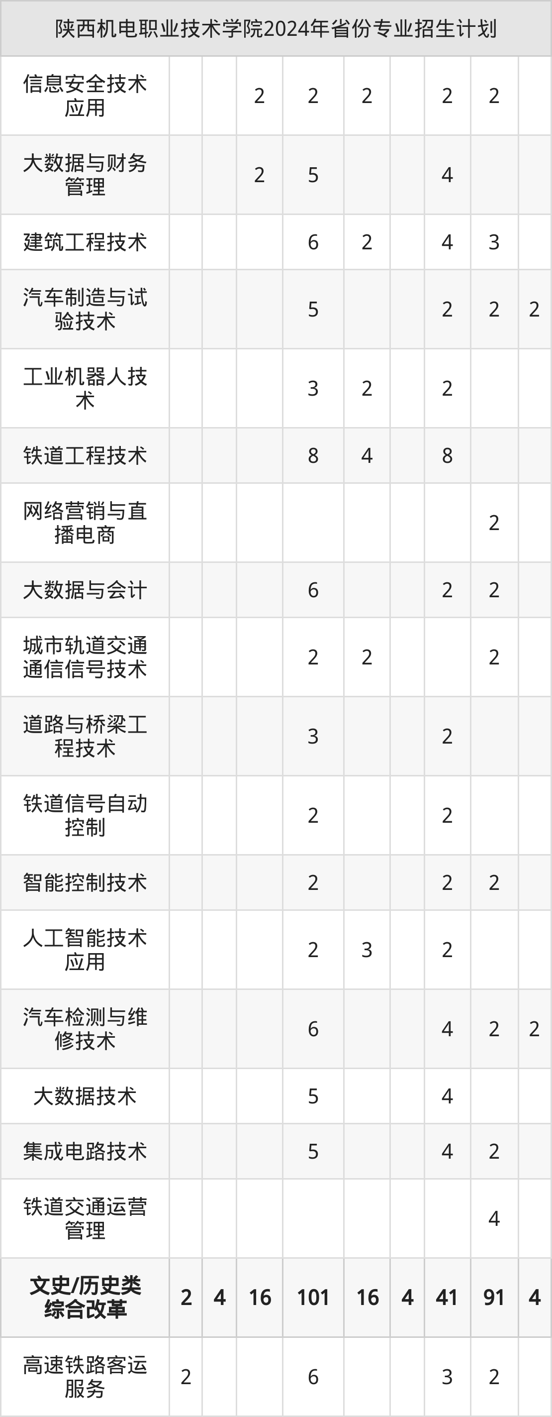 2024年陕西机电职业技术学院计划招收专科生2358人,其中建筑工程技术专业54人,智能控制技术专业12人,集成电路技术专业32人,高速铁路客运服务专业106人,智能建造技术专业32人等。