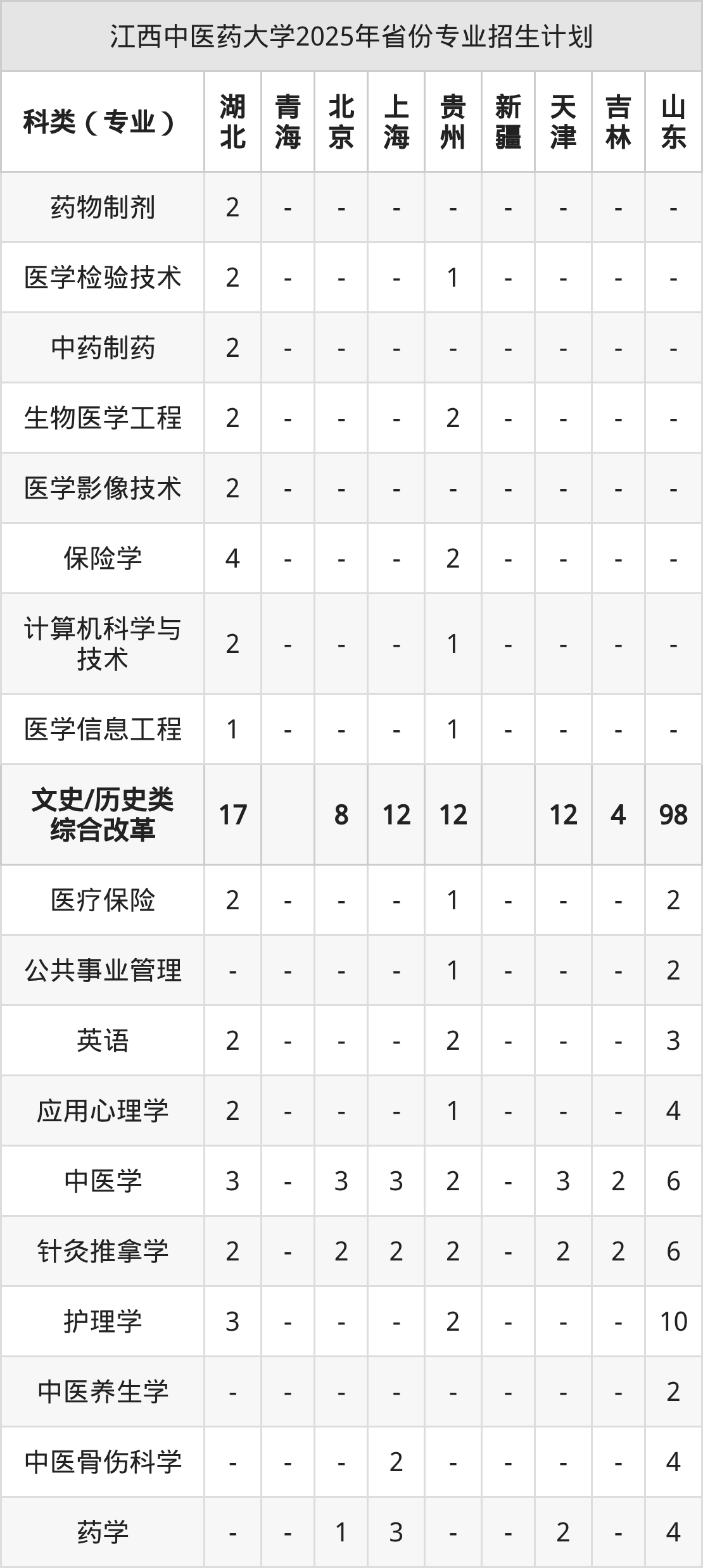 而各省份的招生计划数为吉林15人,重庆43人,安徽169人,福建28人,辽宁8人等。