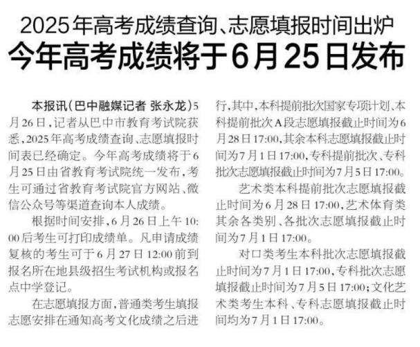 2025年四川高考出分数时间预计在6月25日,报考时间各批次不一样,本科提前批6月28日截止、本科批7月1日截止、专科批7月5日截止,本文附上了四川高考成绩查询入口官网和填报志愿网址,各位同学可直接点击登录。