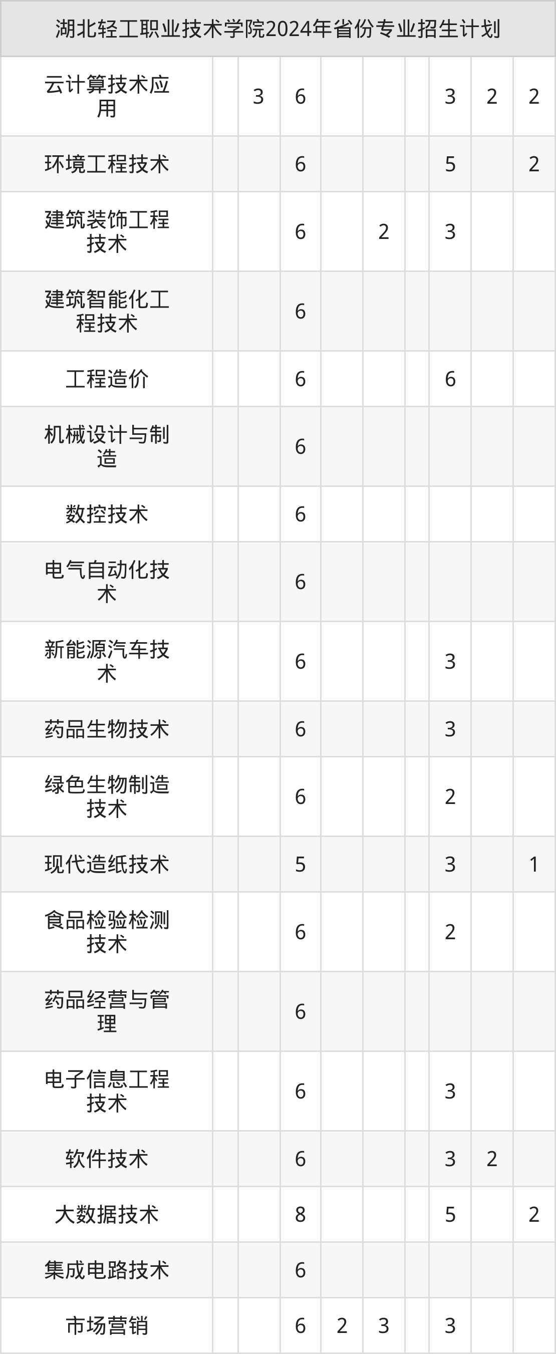 2024年湖北轻工职业技术学院计划招收专科生1130人,其中建筑装饰工程技术专业34人,机电一体化技术专业140人,工程造价专业32人,新能源汽车技术专业26人,大数据技术专业45人等。