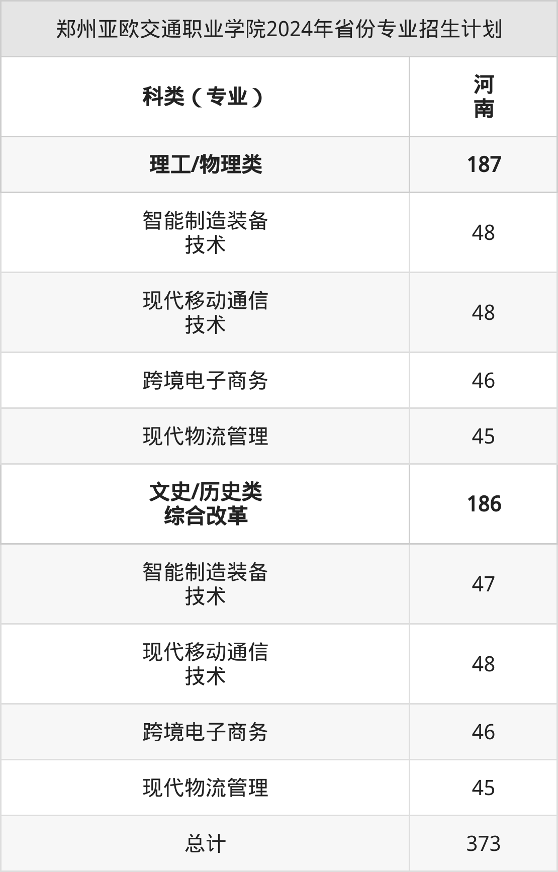 2024年郑州亚欧交通职业学院计划招收专科生373人,其中智能制造装备技术专业95人,现代移动通信技术专业96人,跨境电子商务专业92人,现代物流管理专业90人。