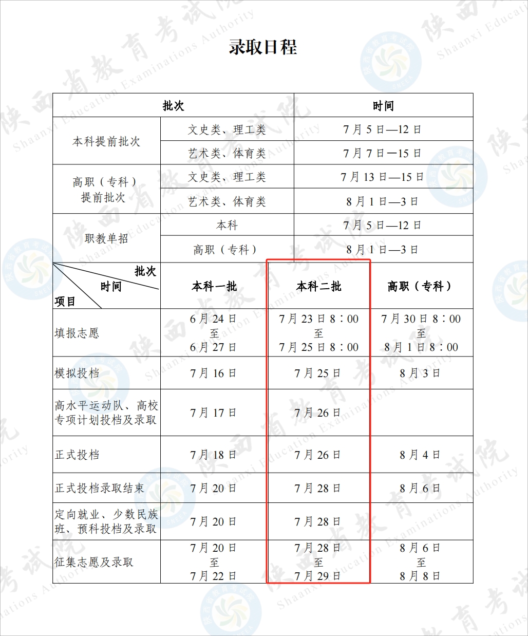 2024年陕西省二本录取时间安排如下表所示: