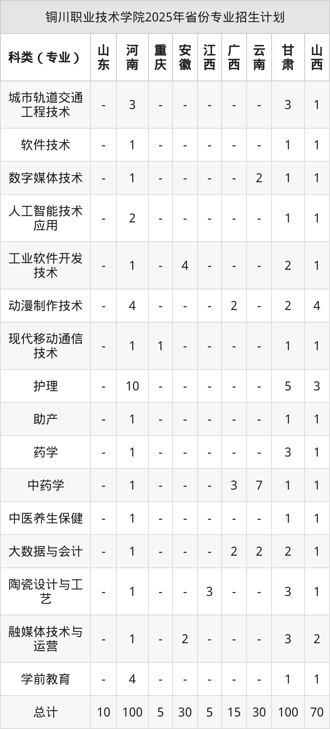 而各省份的招生计划数为河南100人,安徽30人,甘肃100人,山西70人,河北30人等。