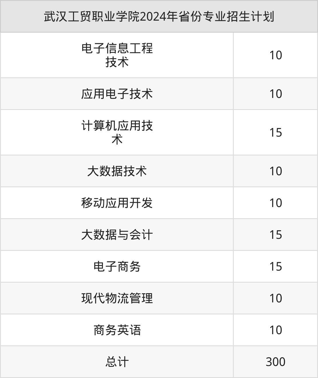 2024年武汉工贸职业学院计划招收专科生300人,其中大数据技术专业20人,大数据与会计专业30人,电子商务专业30人,商务英语专业20人,计算机应用技术专业30人等。