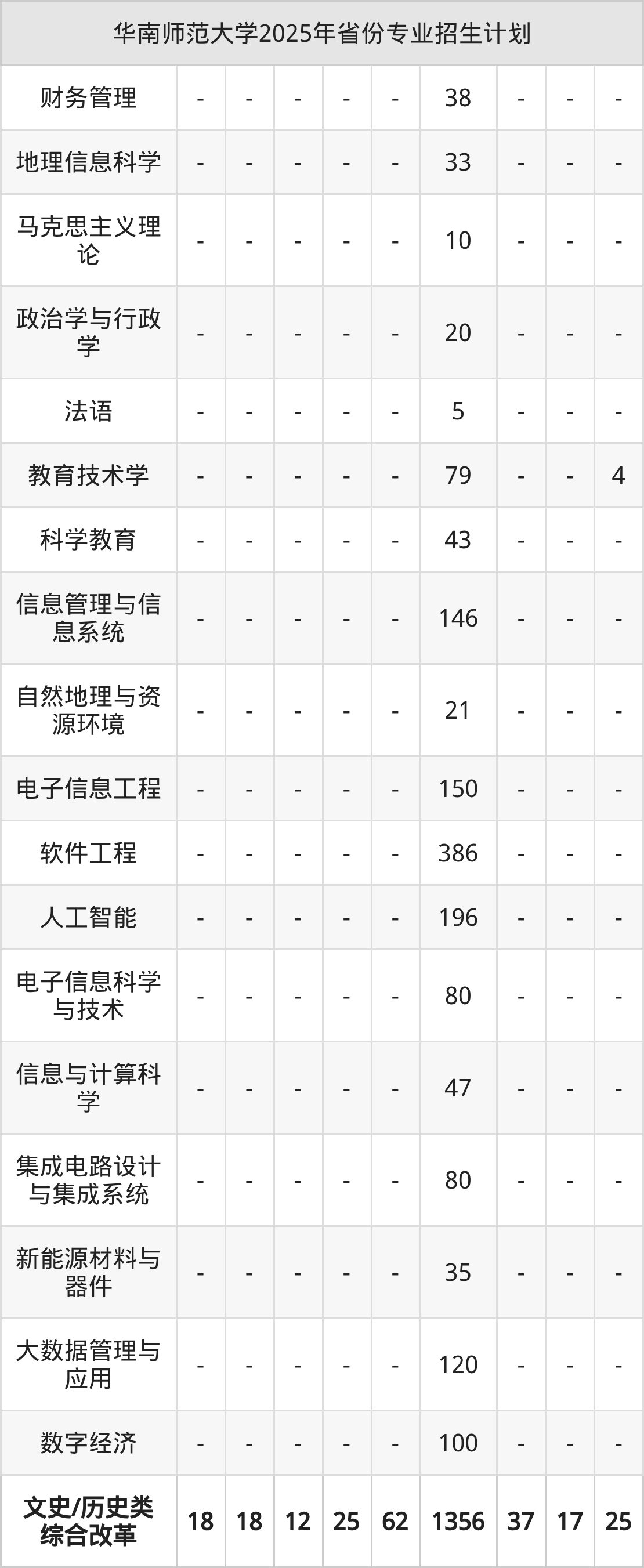 2025年华南师范大学计划招收本科生5622人,其中教育技术学专业103人,信息管理与信息系统专业146人,应用心理学专业48人,历史学专业188人,社会工作专业40人等。
