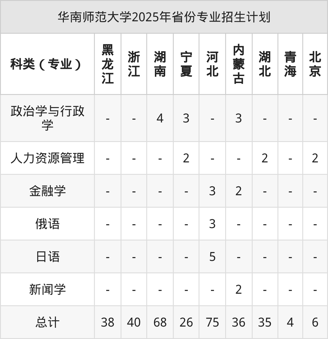 而各省份的招生计划数为黑龙江38人,北京6人,天津5人,江苏20人,辽宁35人等。