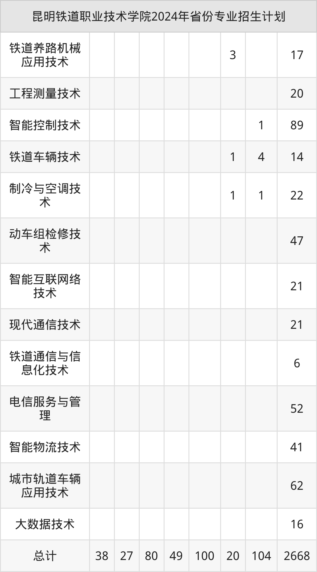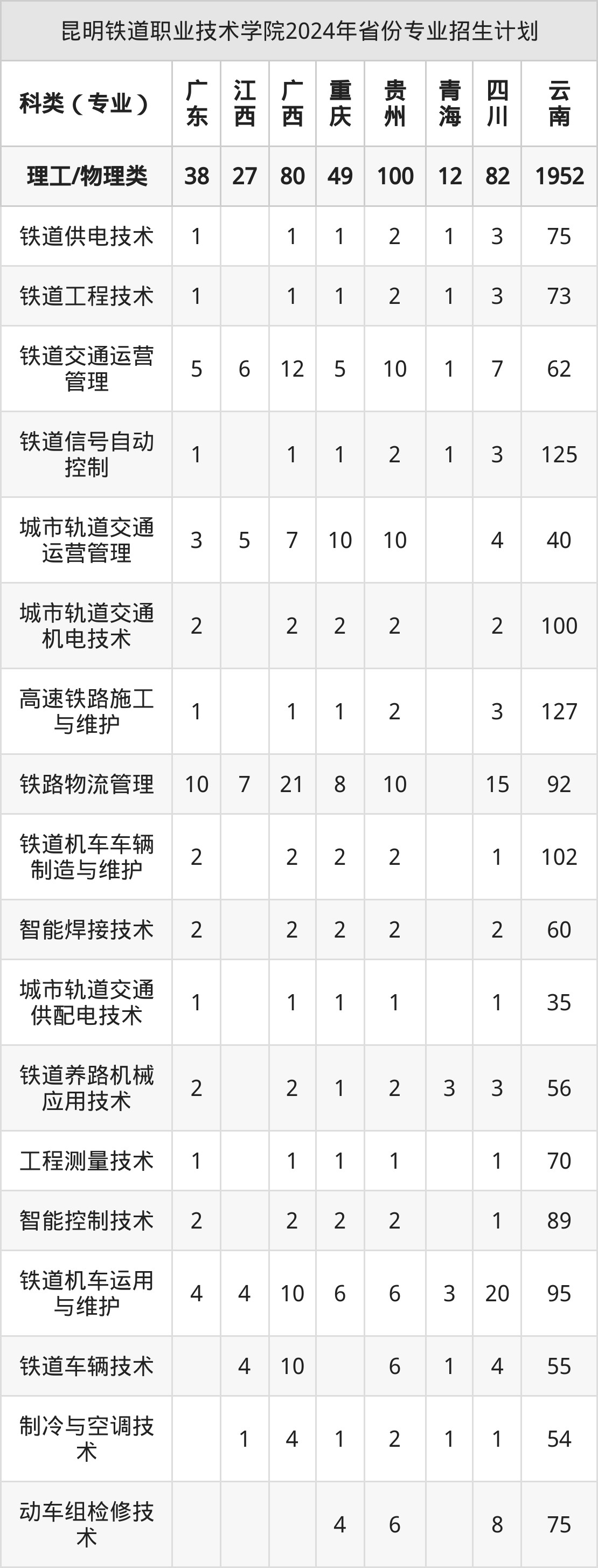 2025年昆明铁道职业技术学院专科招生计划待公布,下面附上2024年数据,暂供参考: