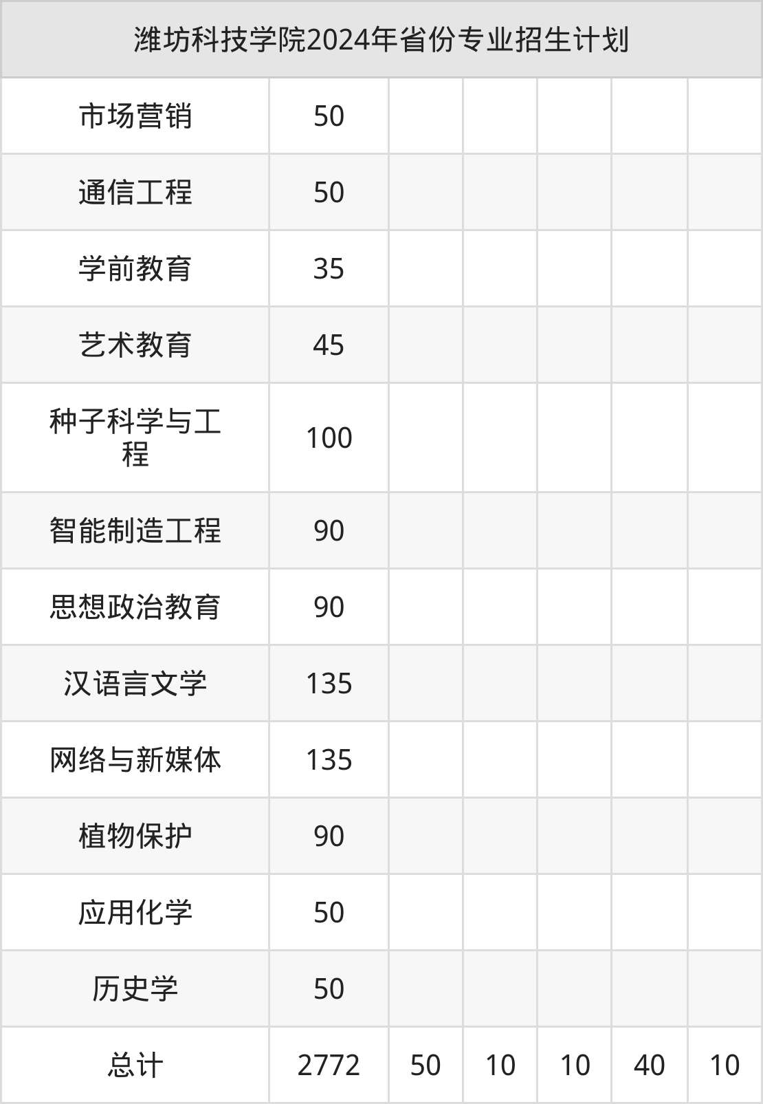 2024年潍坊科技学院计划招收本科生3197人,其中社会工作专业50人,通信工程专业50人,学前教育专业35人,机械设计制造及其自动化专业49人,物联网工程专业45人等。