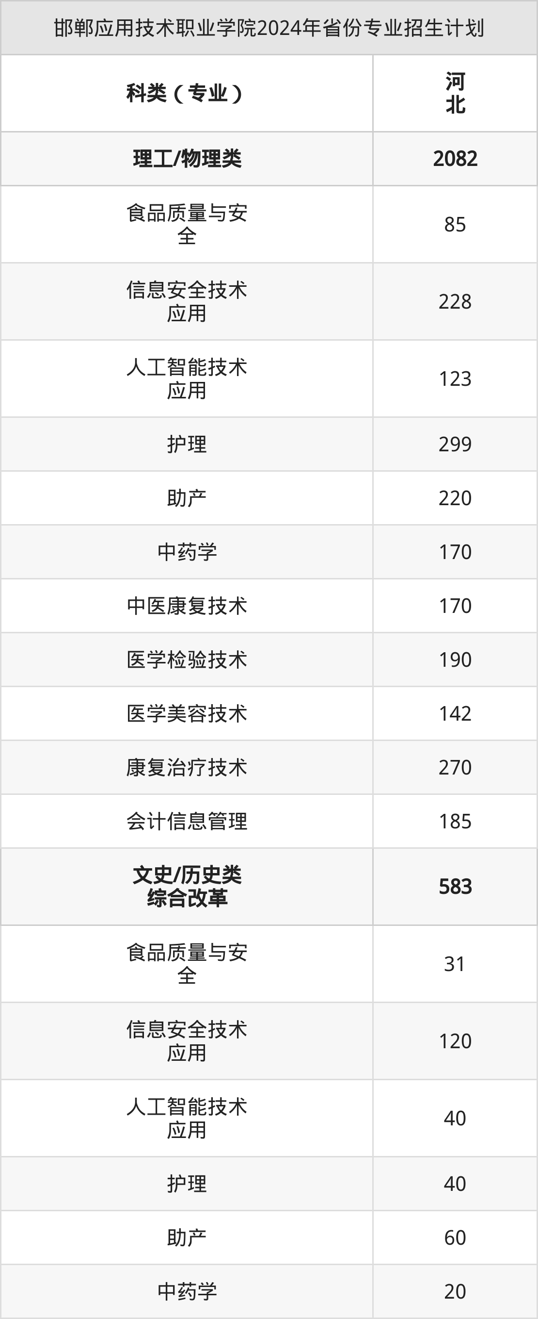 2025年邯郸应用技术职业学院专科招生计划待公布,下面附上2024年数据,暂供参考:
