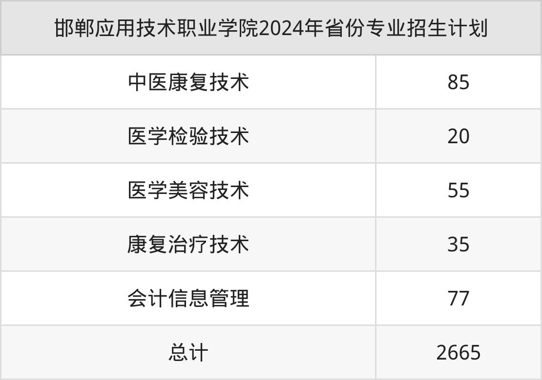 2024年邯郸应用技术职业学院计划招收专科生2665人,其中食品质量与安全专业116人,中药学专业190人,中医康复技术专业255人,医学检验技术专业210人,医学美容技术专业197人等。