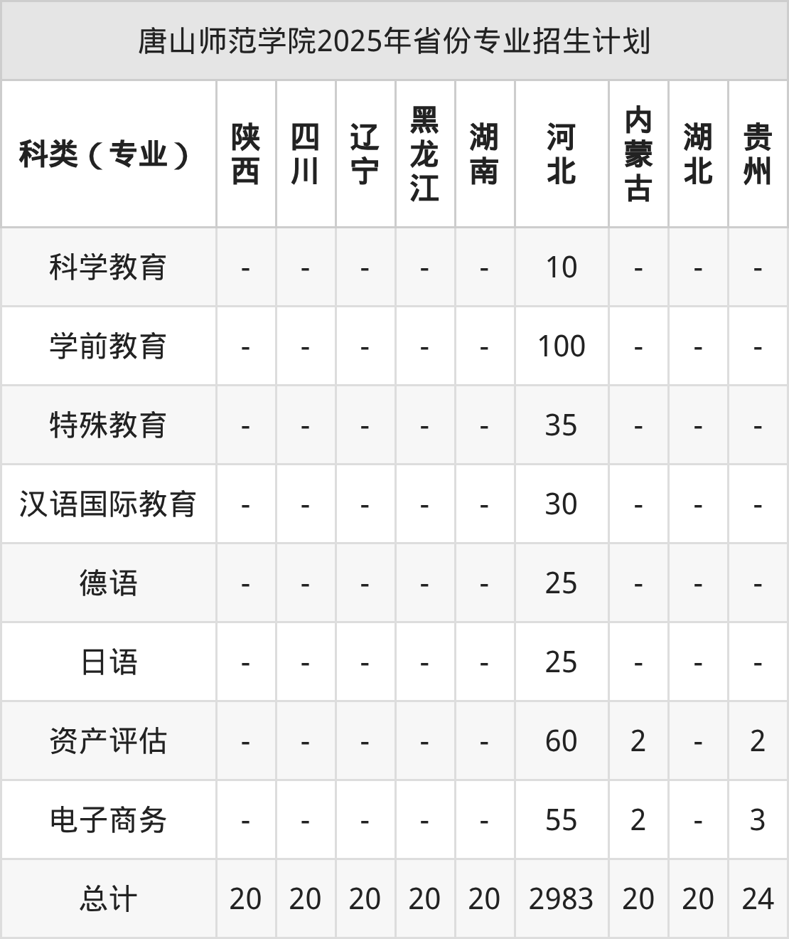 而各省份的招生计划数为河北2983人,贵州24人,吉林20人,山东28人,重庆20人等。