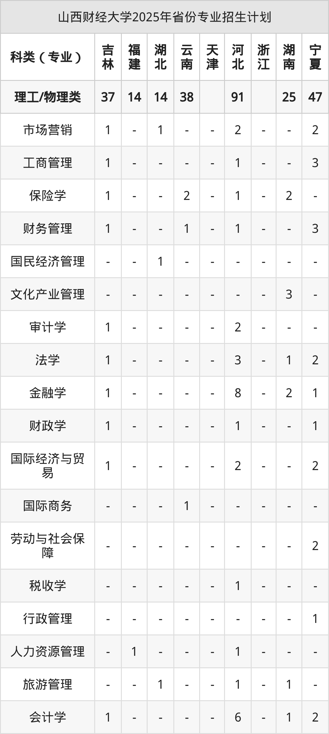 2025年山西财经大学计划招收本科生4617人,其中税收学专业99人,新闻学专业100人,金融工程专业100人,能源经济专业100人,信息管理与信息系统专业50人等。
