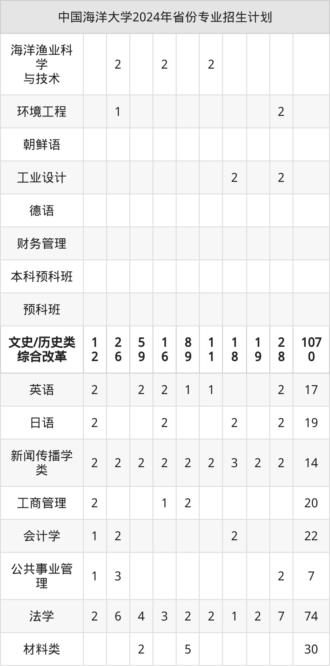 2024年中国海洋大学计划招收本科生3786人,其中旅游管理专业28人,公共事业管理专业31人,材料类专业141人,声学专业60人,工业设计专业30人等。