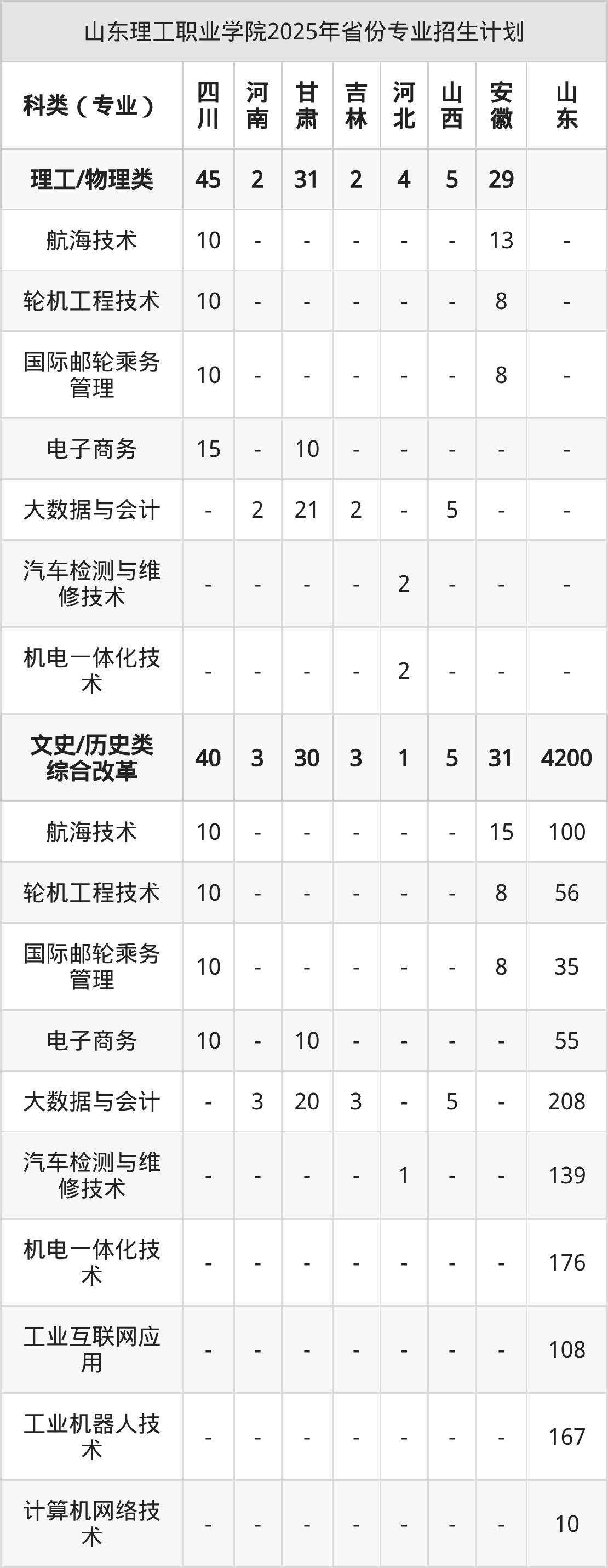 而各省份的招生计划数为安徽60人,山东4200人,四川85人,吉林5人,河北5人等。