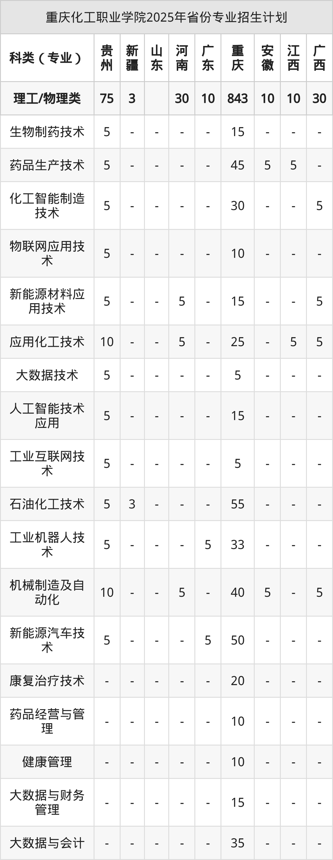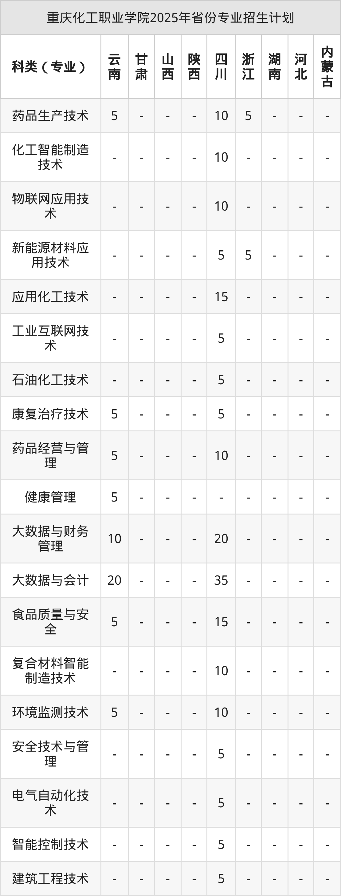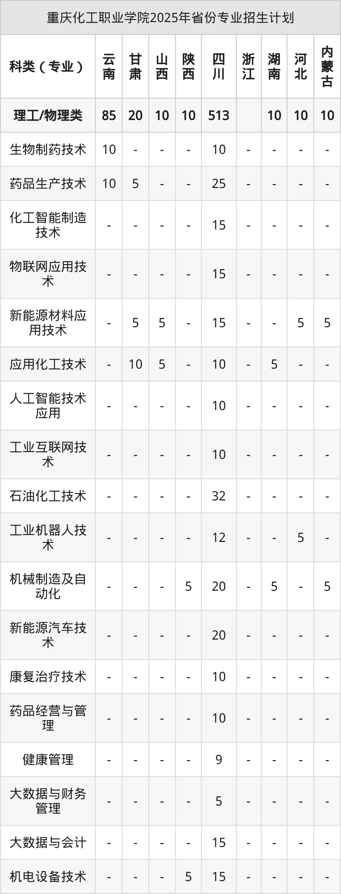 2026年重庆化工职业学院专科招生计划待公布,下面附上2025年数据,暂供参考: