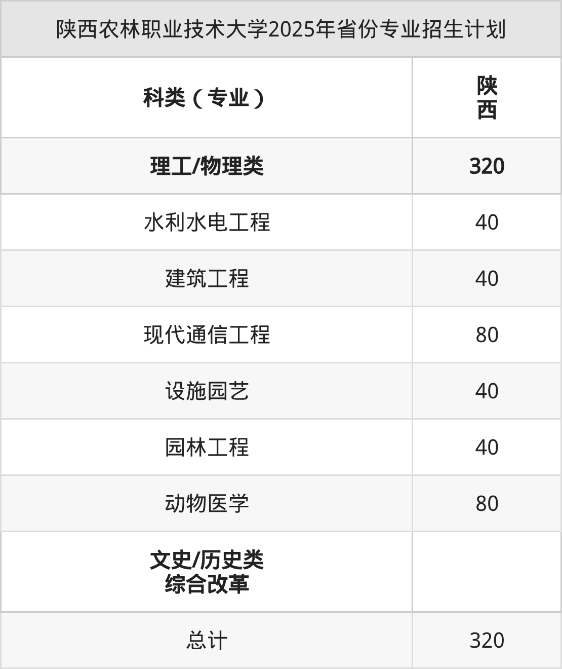 陕西农林职业技术大学2026年招生简章预计在6月发布,目前同学们可以先参考2025年招生简章。信息显示,该校计划面向1个地区招收本科生320人,其中建筑工程专业40人,现代通信工程专业80人。