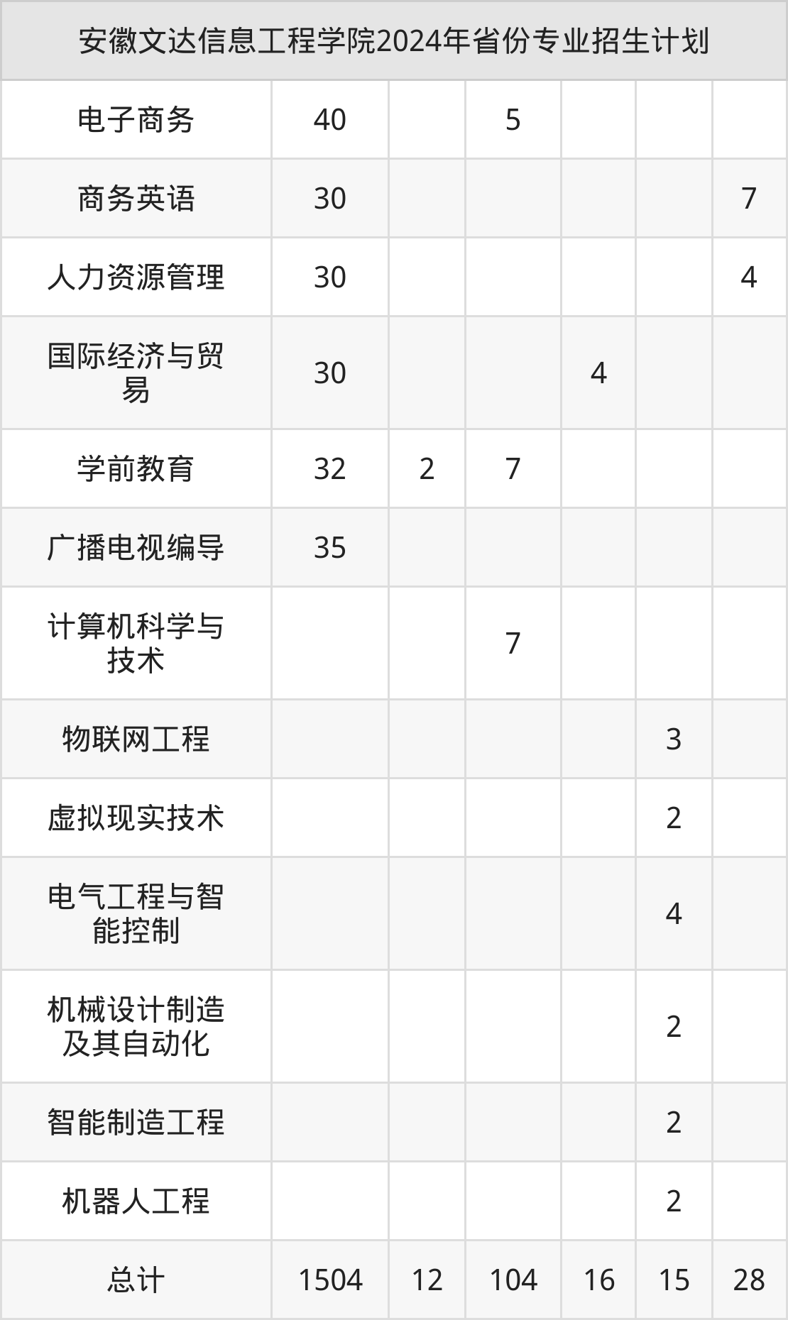 而各省份的招生计划数为安徽1504人,陕西12人,河南104人,江苏16人,山东15人等。