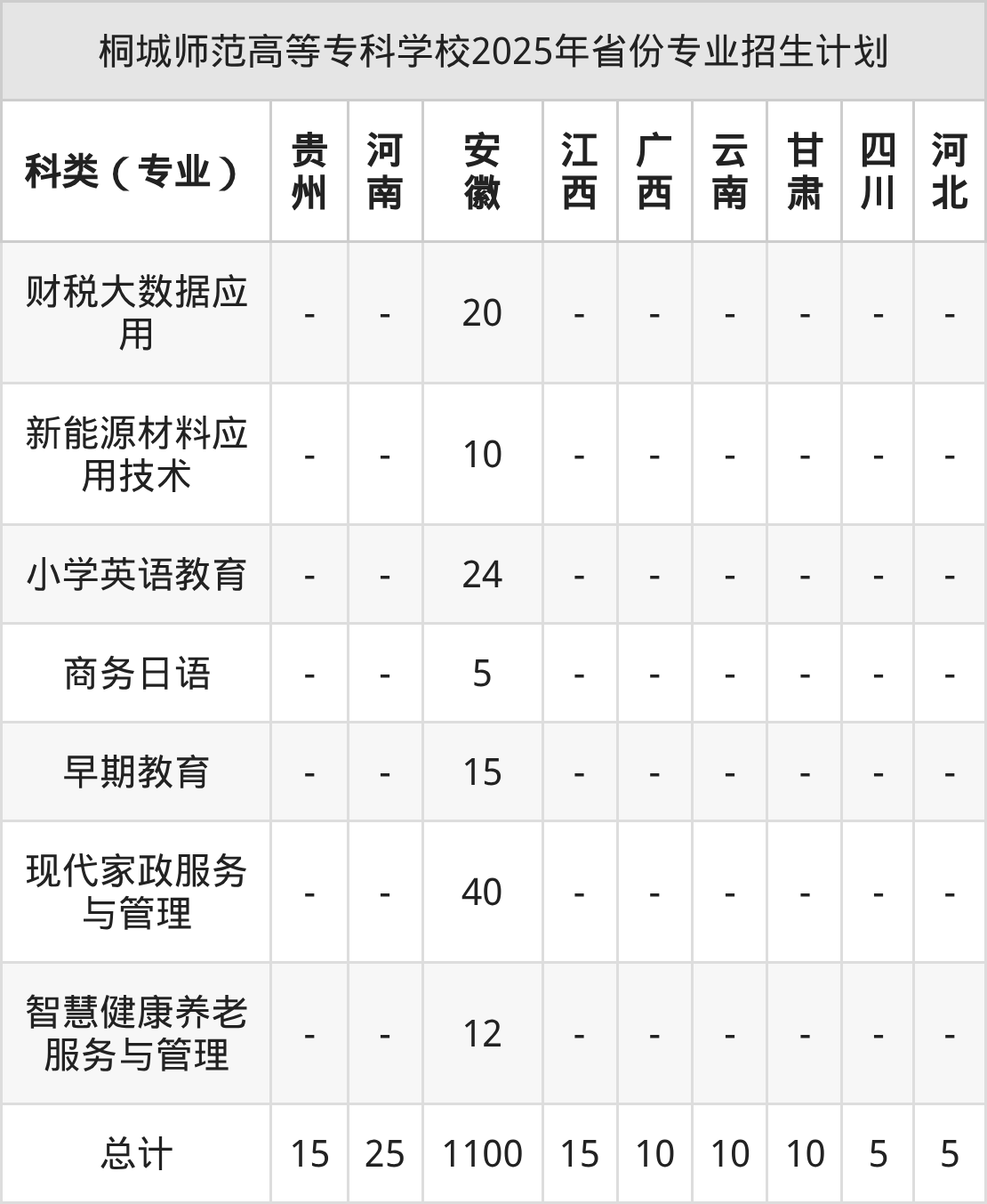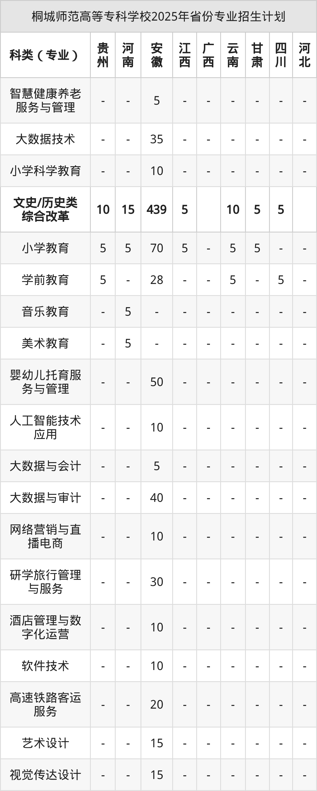 2026年桐城师范高等专科学校专科招生计划待公布,下面附上2025年数据,暂供参考: